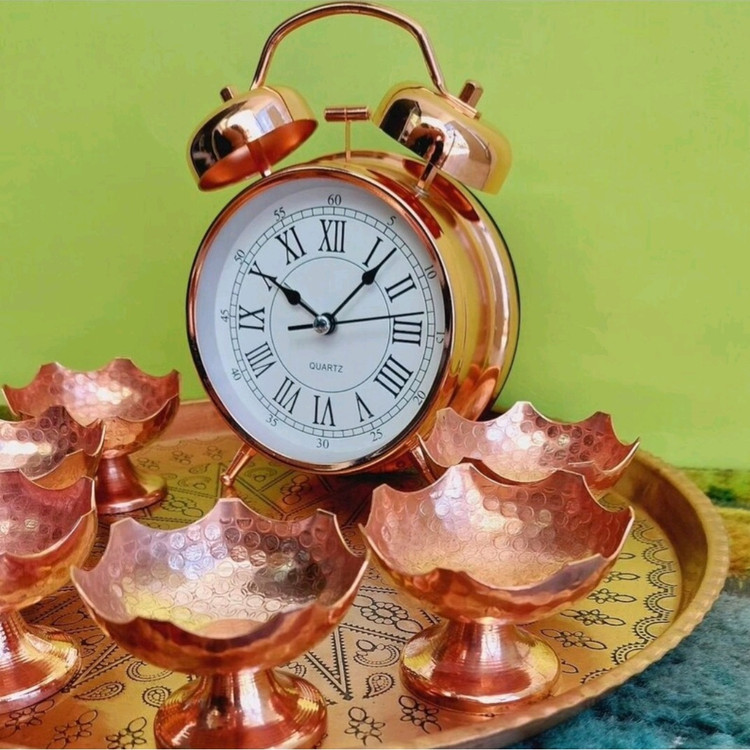 ساعت مسی هفت سین سایز 1 ارتفاع ۱۳ قطر 8 سانت زنگ دار کوکی باطری خوری در رنگ مسی
