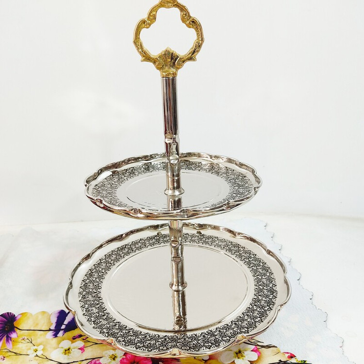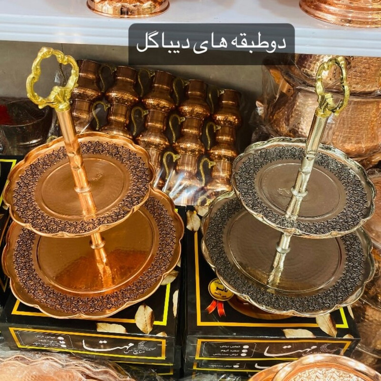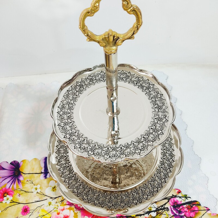 شیرینی خوری مسی کروم دیبا گل دو طبقه در مس زنجان نمونه