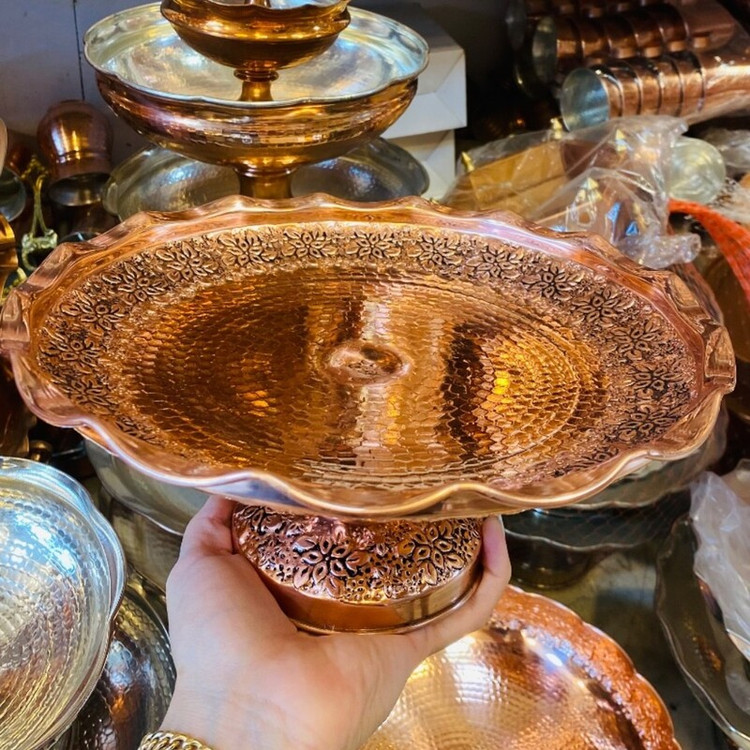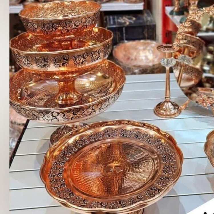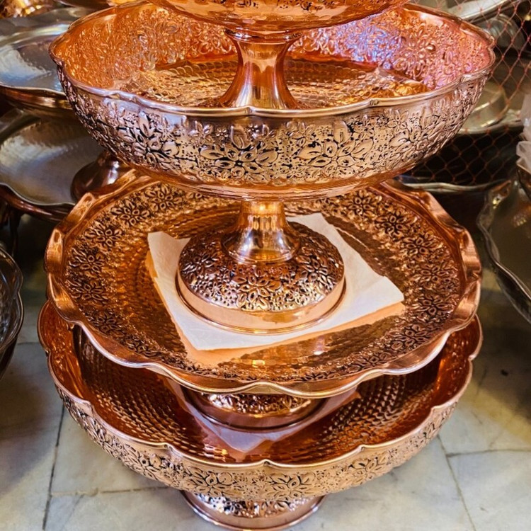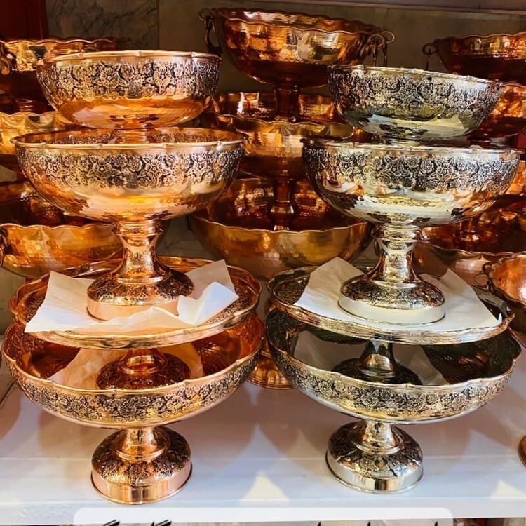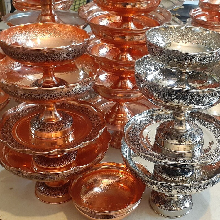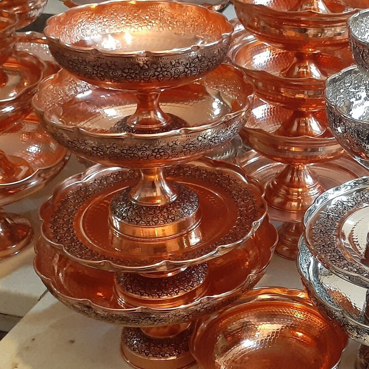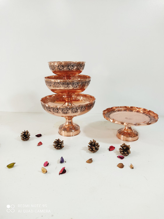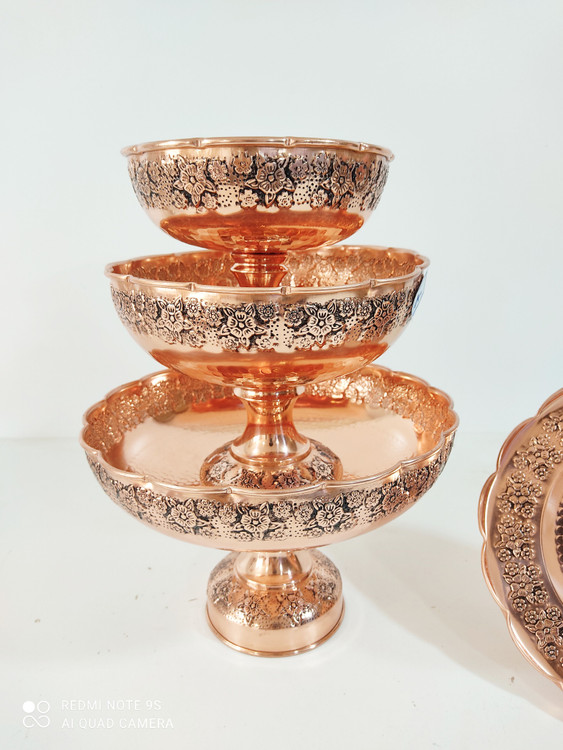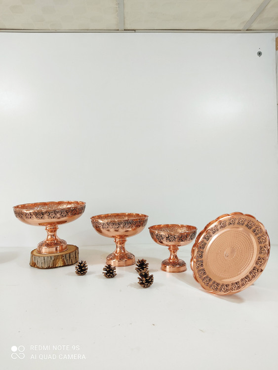سرویس پایه دار پذیرایی تک پایه 4 تیکه مسی گلبرگ چکشی سیاه قلم زنگ مسی شامل : میوه خوری قطر 28 سانت آحیل خوری قطر 22 سانت شیرینی خوری قطر 25 سانت شکلات خوری قطر 18 سانت