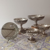 سرویس پایه دار پذیرایی تک پایه 4 تیکه رنگ کروم گلبرگ مسی چکشی سیاه قلم شامل : میوه خوری قطر 28 سانت آحیل خوری قطر 22 سانت شیرینی خوری قطر 25 سانت شکلات خوری قطر 18 سانت