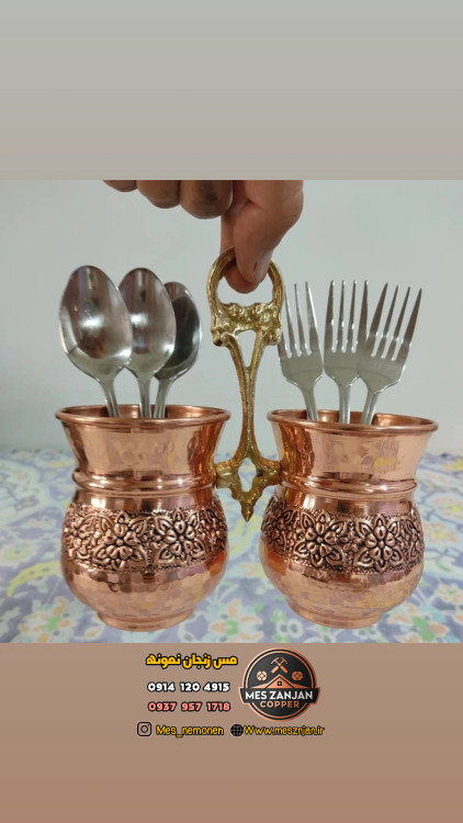 این جا قاشقی علاوهبر نظمدادن به قاشق، چنگال و کاردهای آشپزخانه، بهعنوان یک عنصر دکوراتیو نیز زیبایی محیط را چند برابر میکند. رنگ گرم مس در کنار نقشهای ظریف سیاهقلم، آن را مناسب استفاده در آشپزخانههای سنتی، مدرن و حتی ویترین دکوری میسازد.