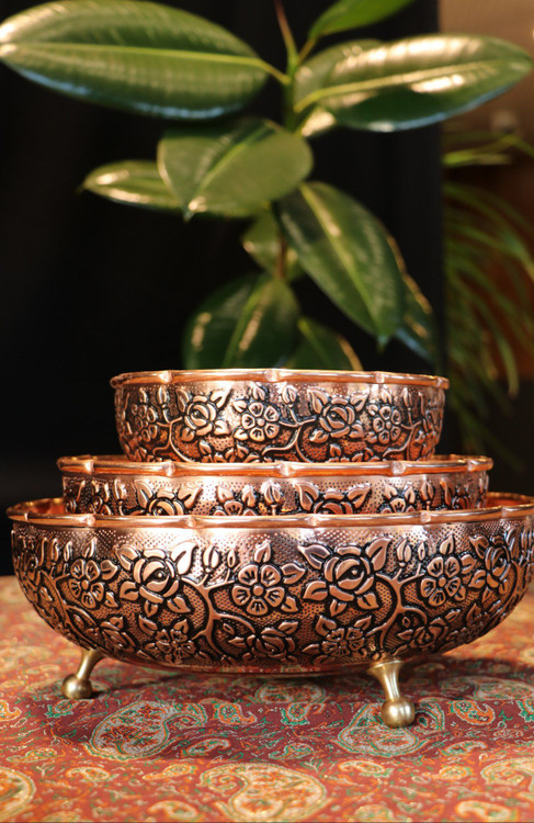 این سرویس زیبا با طراحی الهامگرفته از گلبرگهای درشت و هنر اصیل مسگری ایرانی، جلوهای لوکس و چشمنواز به پذیرایی شما میبخشد. بدنهی تماممسی، پرداخت آنتیک و فرم هنرمندانهی ظروف، این محصول را به انتخابی شیک برای مهمانیها، دکوراسیون منزل و سرو انواع شیرینی، میوه و خشکبار تبدیل کرده است.