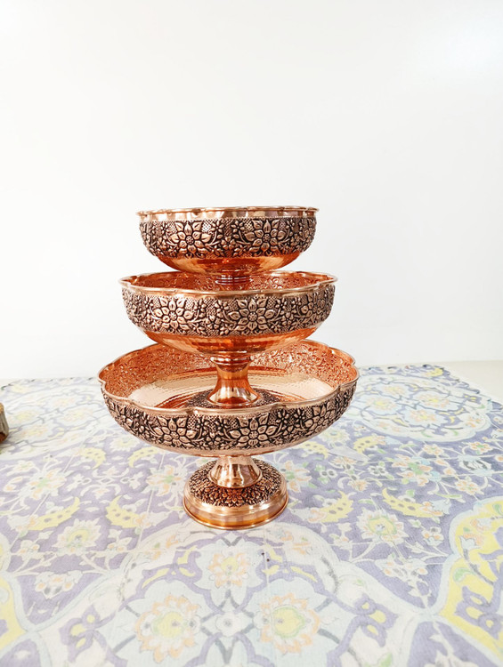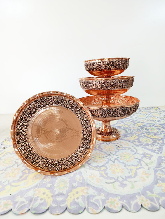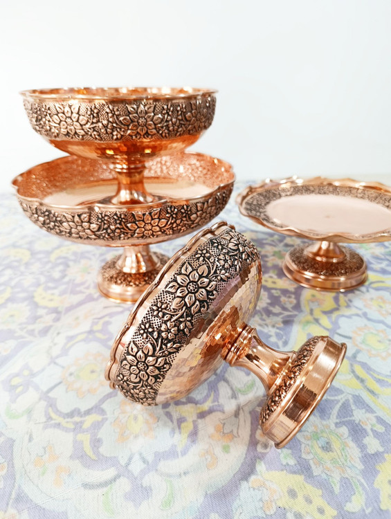 سرویس پایه دار پذیرایی تک پایه 4 تیکه مسی گلبرگ چکشی سیاه قلم رنگ مسی شامل :