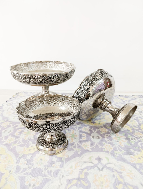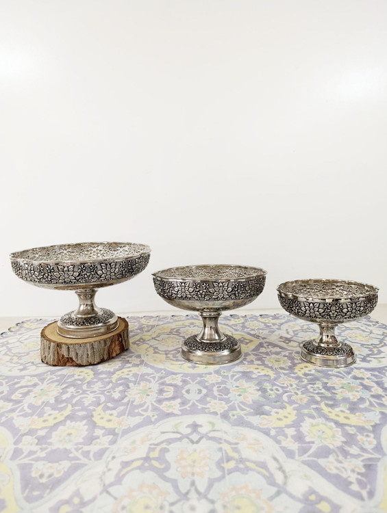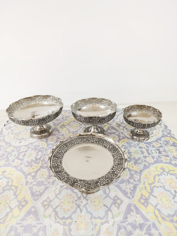 سرویس پایه دار پذیرایی تک پایه 4 تیکه مسی گلبرگ چکشی سیاه قلم رنگ کروم شامل :