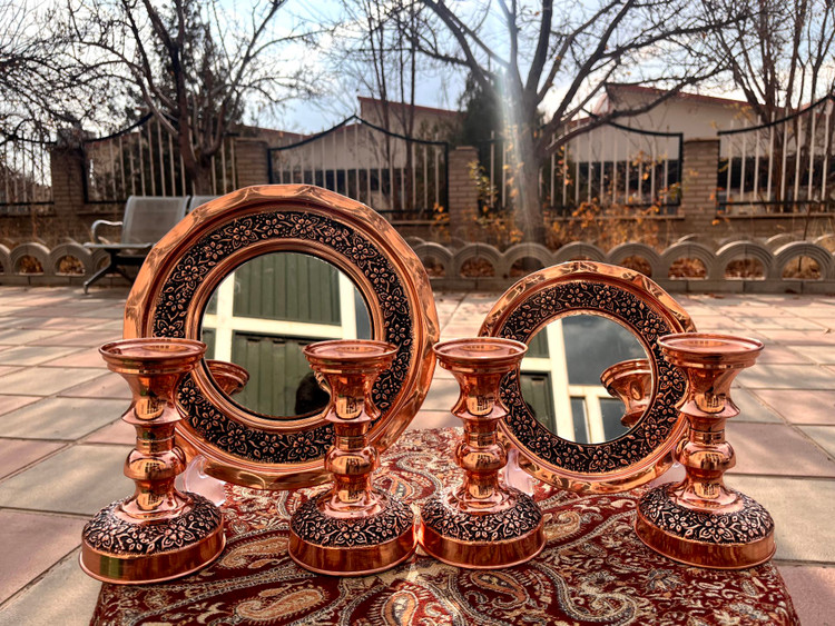 سرویس هفت سین مسی گلبرگ با آینه و شمعدان مسی سیاه قلم (نقلی 9 تیکه)