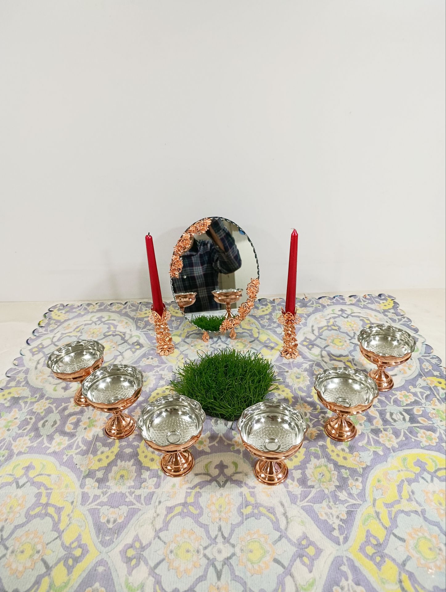 هفت سین مسی ۶ عددی، پیاله پایه دار و بستنی خوری مسی ارتفاع ۱۰ قطر ۹