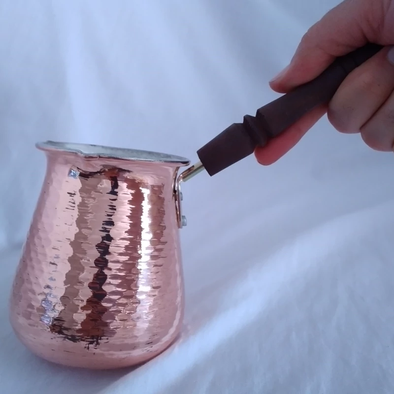 شیر جکش (قهوه جوش)مسی دسته چوبی سایز بزرگ زنجان داخل قلع چکش کاری شده است 5 کاپ گنجایش