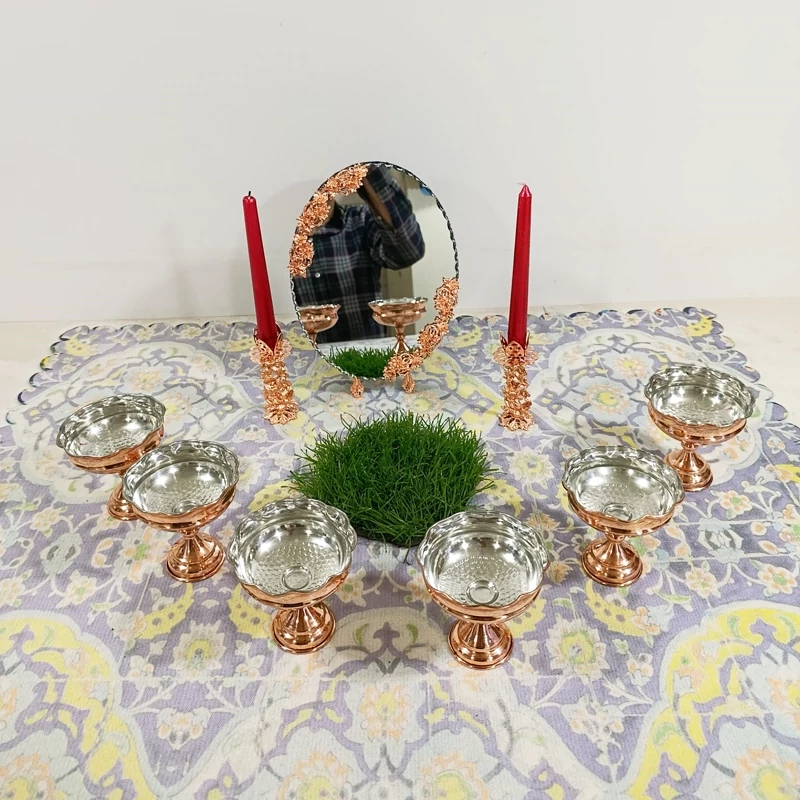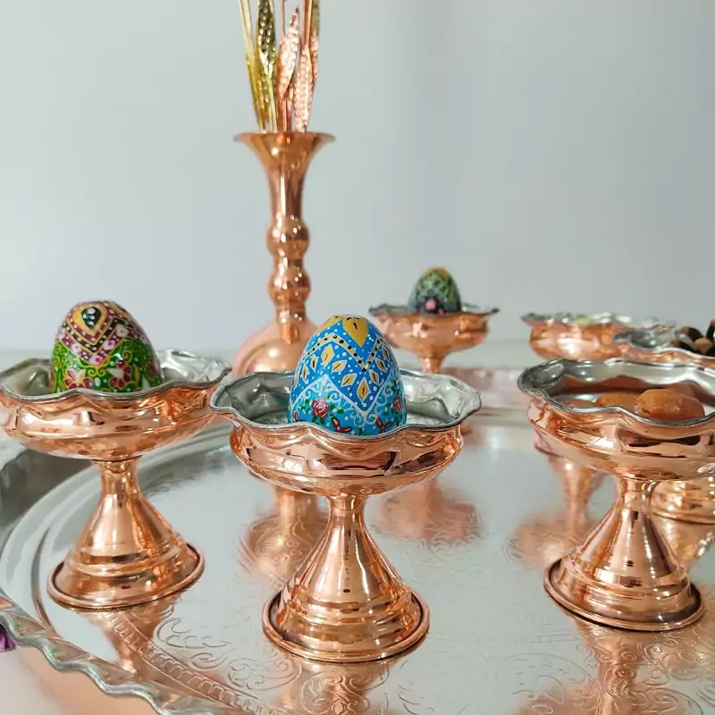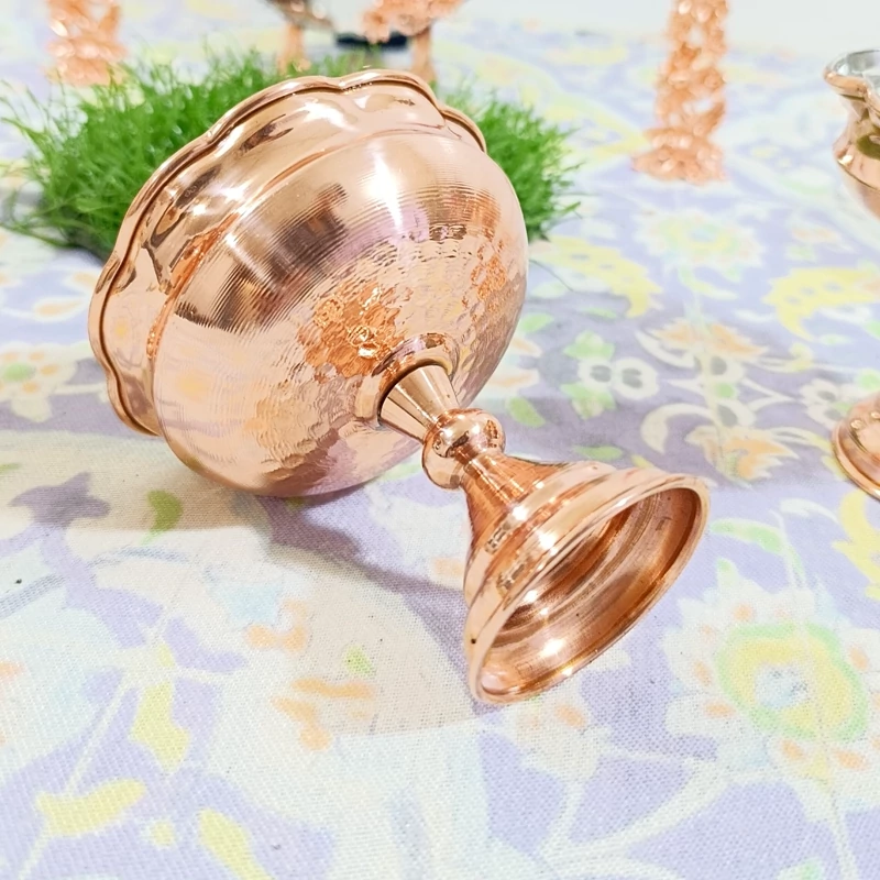 تنقلات خوری داخل قلع شده ی مسی بسته 6 تایی چکش کاری شده مناسب سفره هفت سین تک پایه ارسال رایگان کلا روکش نانو دور چین دار نانو شده و رنگ ثابت مناسب آجیل و یا هفت سین نوروزی و بستنی خوری ارسال رایگان قطر دهانه 10 سانتیمتر وزن کلی 450 گرم