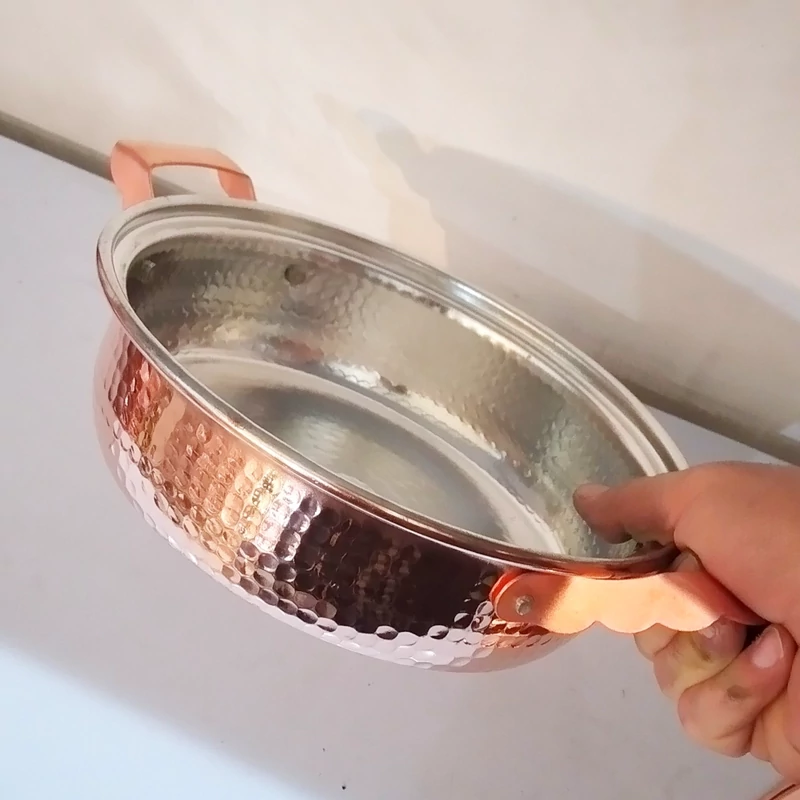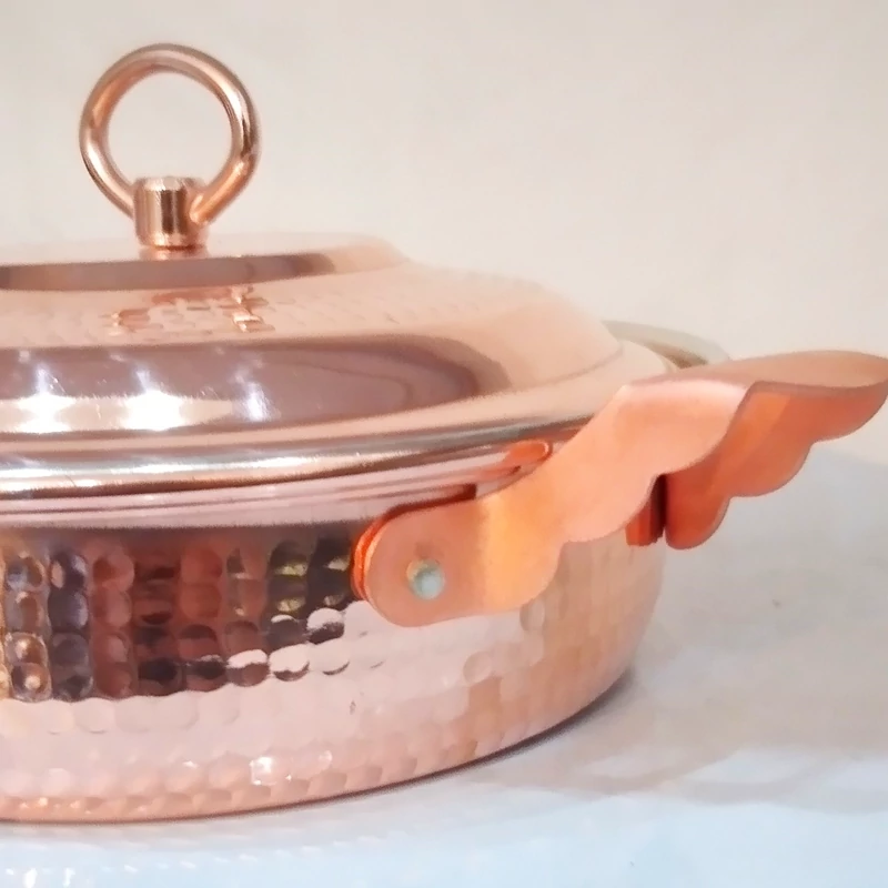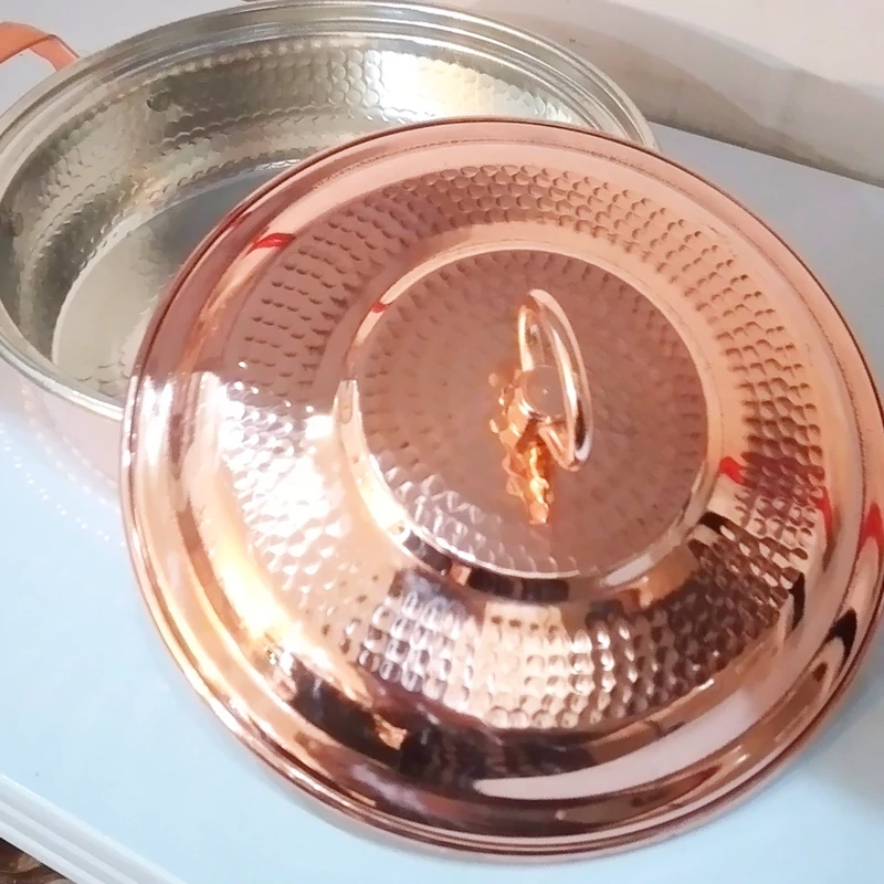 ماهیتابه مسی زنجان قطر ۲۲ دودسته دار و در دار چکش کاری شده و داخل قلع کاری شده معر نوین مس زنجان که سازنده باکیفیت ترین قابلمه و تابه است کار بسیار ضخیم و با کیفیت کزن کار تقریبی میباشد بسیار شفاف و براق