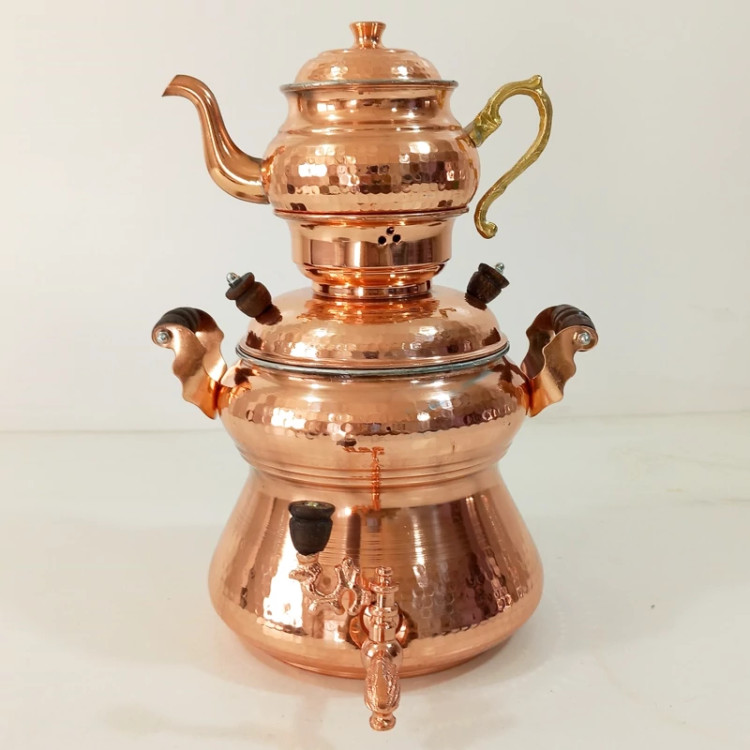 کتری یا سماور روگازی با قوری مسی زنجان همراه قوری دسته برنجی چکشی