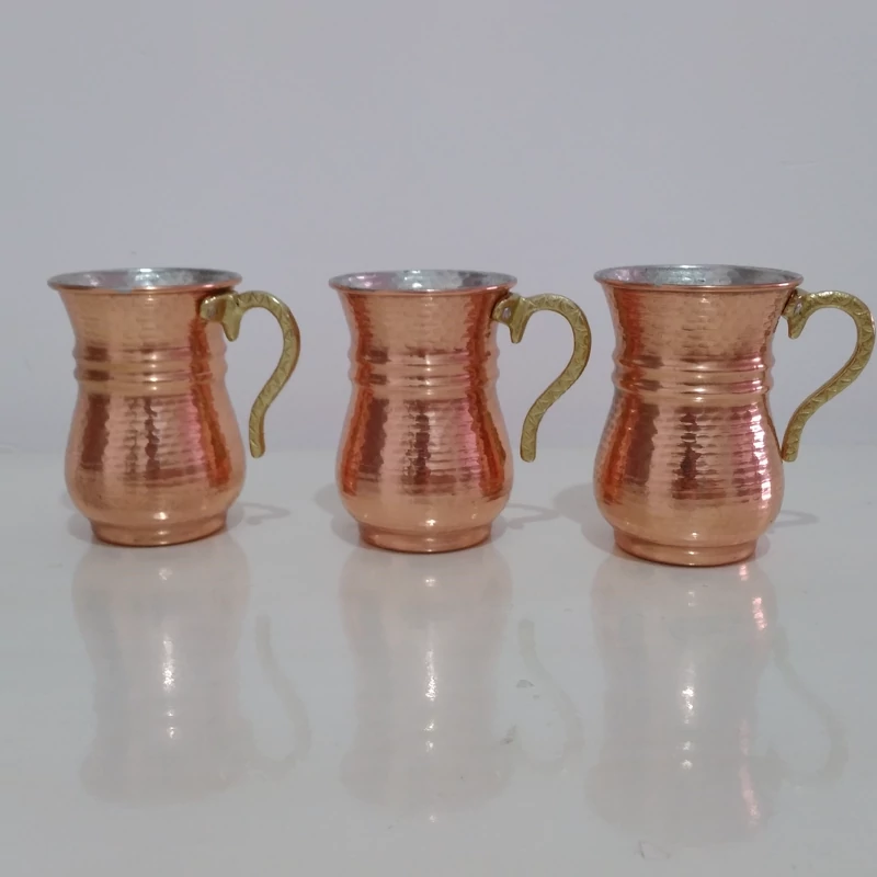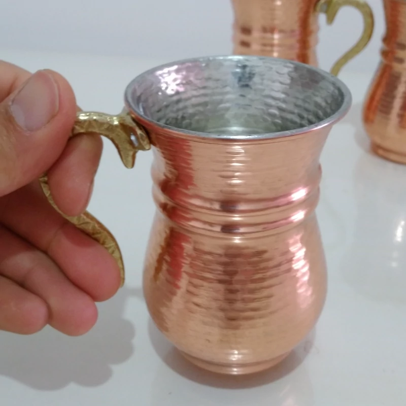 لیوان شش تایی مسی دسته برنجی کمر باریک چکش کاری شده نانو شده بدون تغییر رنگ و کدر شدن قیمت برای شش عدد است