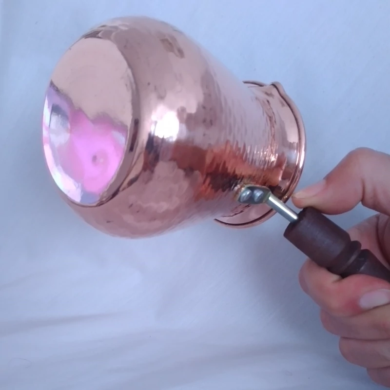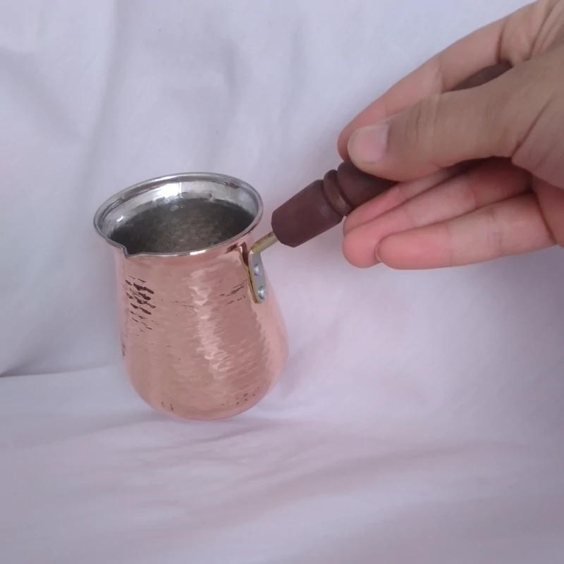 شیر جوش یا قهوه جوش مسی دسته چوبی متوسط ارتفاع 10قطر 7 چکشی داخل قلع شده 🌹🌹خرید بدون واسطه از تولیدی مس رز در زنجان🌹🌹
