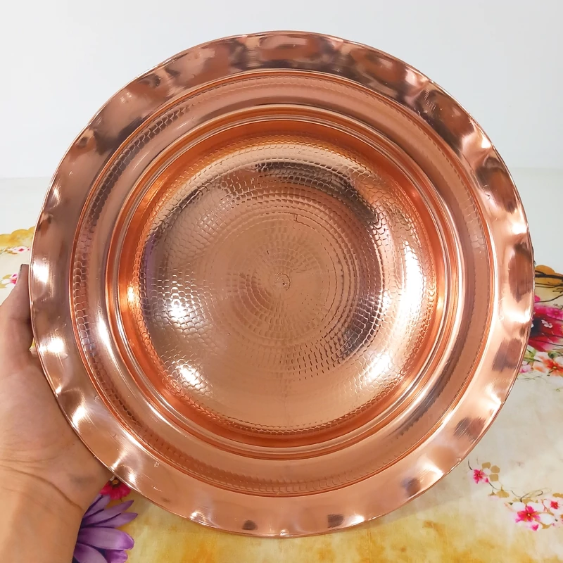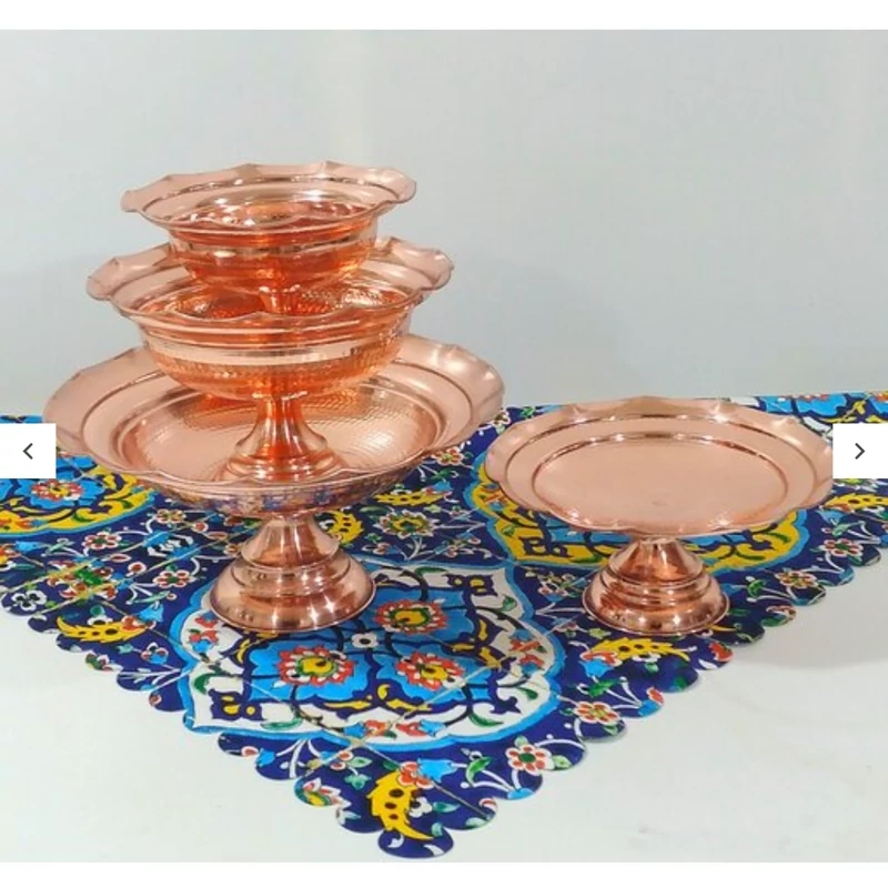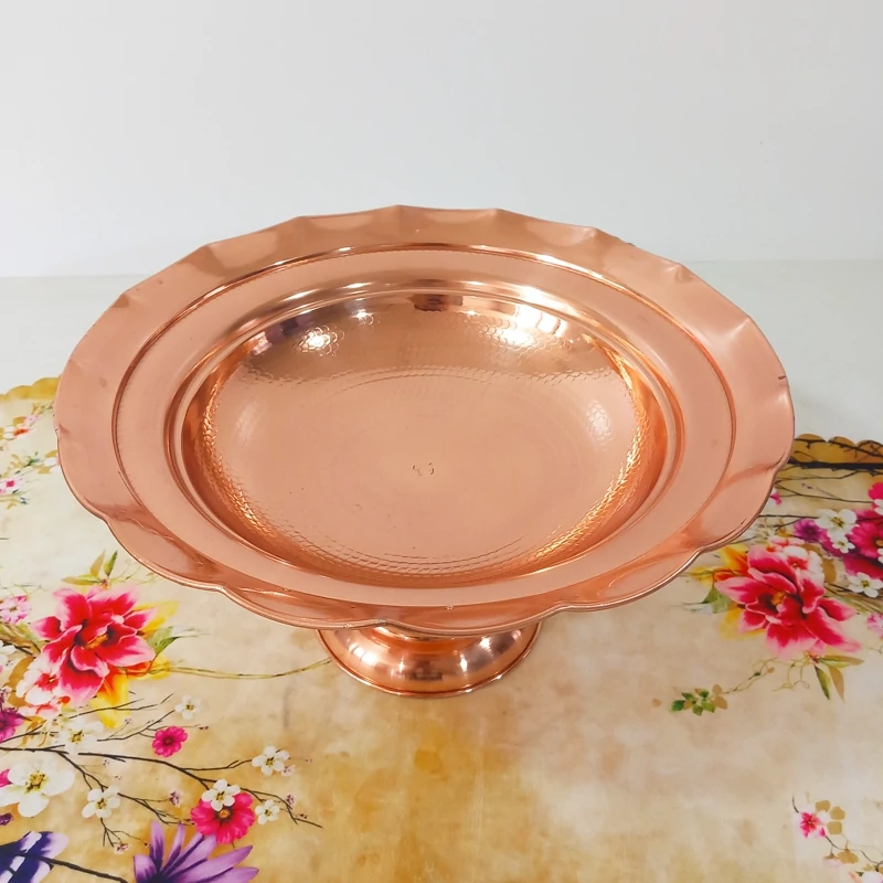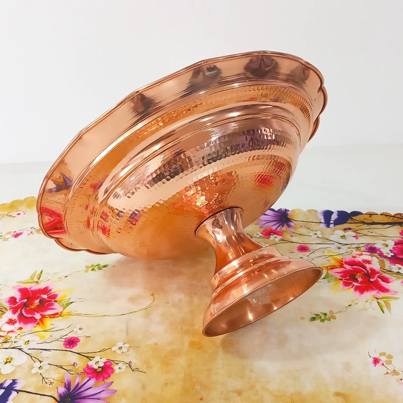 جا میوه ای مسی زنجان چکش کاری شده رنگ ثابت نانو با ضمانت با خالص ترین و ضخیم ترین ورق مسی وزن ۸۰۰ گرم پایه و بدنه مس سرویس پذیرایی ۴ تیکه شکلات و آجیل و شیرنی این کار موجود است