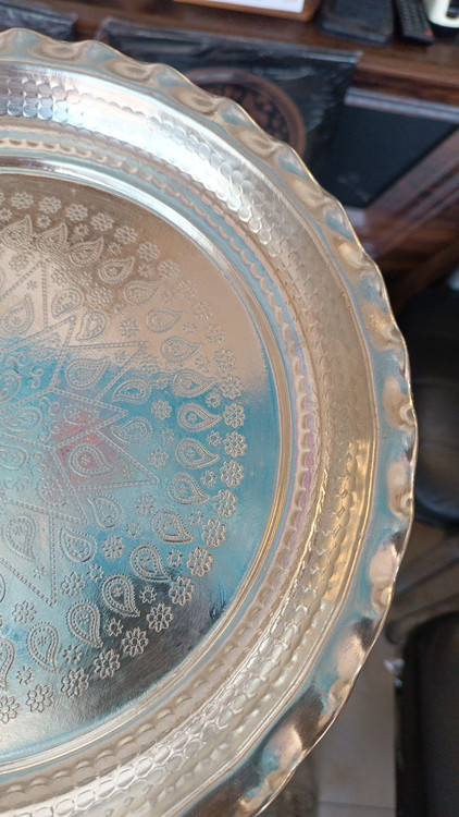 سینی دایره مسی پایه دار طرحدار گوشواره ای.سایز 4 قطر 34 سانت(یک عددی)