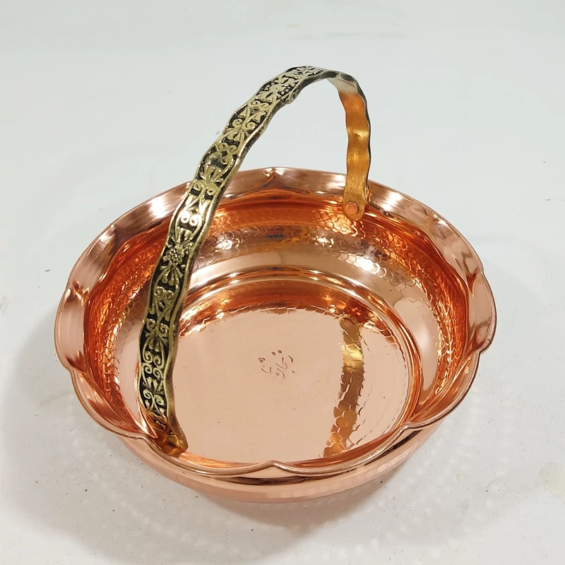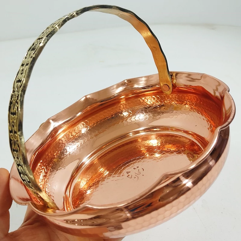 این سبد آجیلخوری مسی با طراحی چشمنواز و ساخت دستی، یکی از خاصترین انتخابها برای پذیرایی، هدیه یا دکور خانههای اصیل ایرانی است. بدنهی آن از مس ناب زنجان ساخته شده و با چکشکاری دقیق دستی شکل گرفته است.