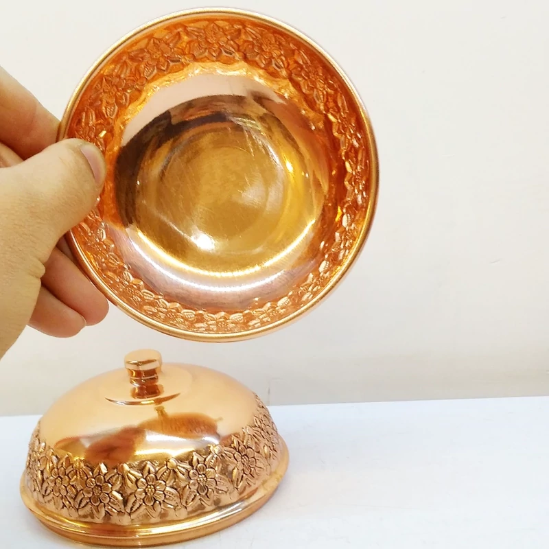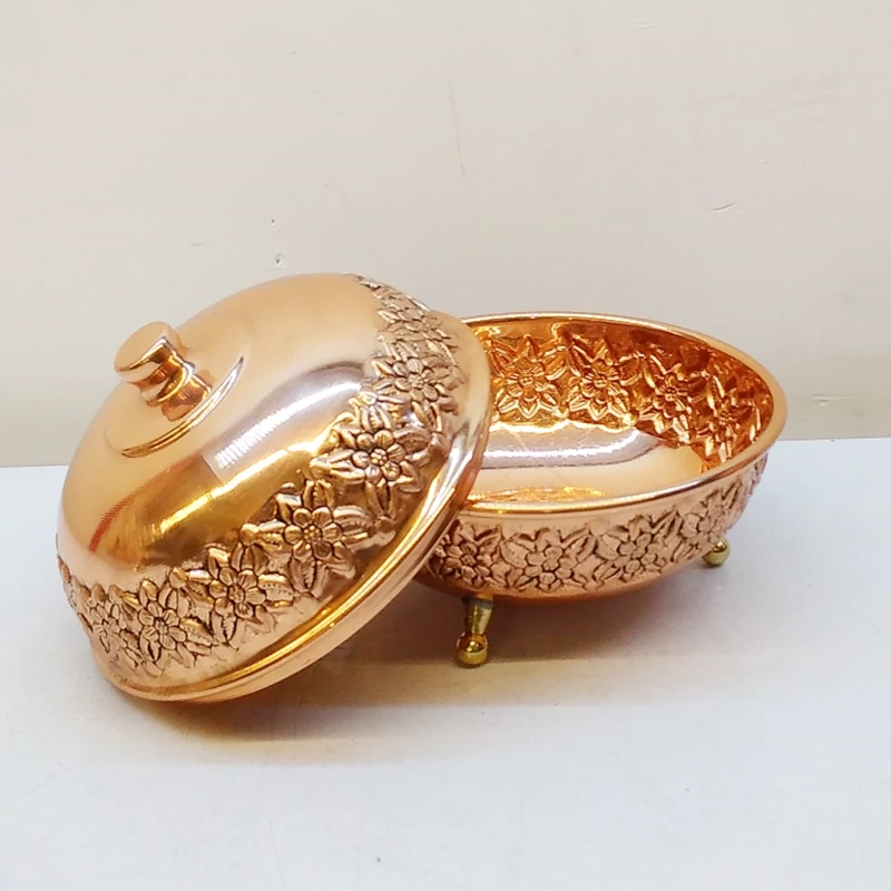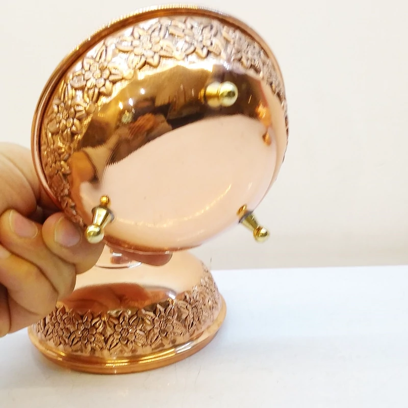 قندان رز مس ۳ پایه دار و تک پایه نانو شده طرح برجسته ی گل کار بسیار جدید و به روز بسیار براق و شفاف و صیقلی با خالص ترین ورق مسی