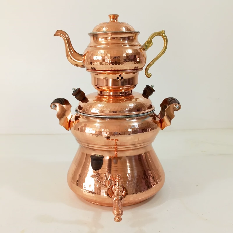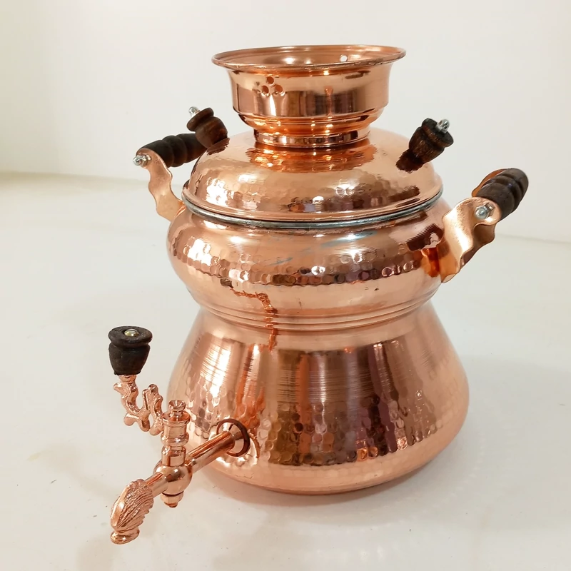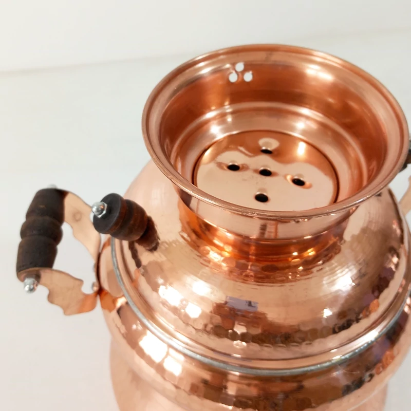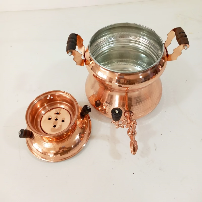 کتری یا سماور روگازی مسی زنجان کاملا دست ساز چکش کاری شده و داخل قلع کاری شده رنگ ثابت نانو شده حجم حدودا 3/5 لیتری ارتفاع 25 سانتیمتر قطر دهانه 15 سانتی متر