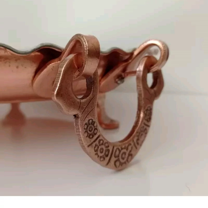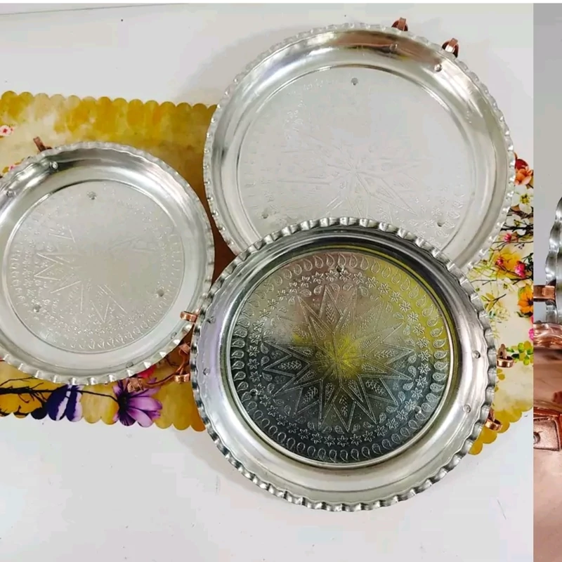 سینی یا مجمع مسی دور کنگره و داخل طرح بسیار زیبا تمام مسی داخل قلع کاری شده و بیرون مسی است که بیرون محصول نانو شده که رنگ ثابت بماند و همیشه شفاف و براق باشد محصول دو دسته و سه پایه دارد در چند سایز موجود
