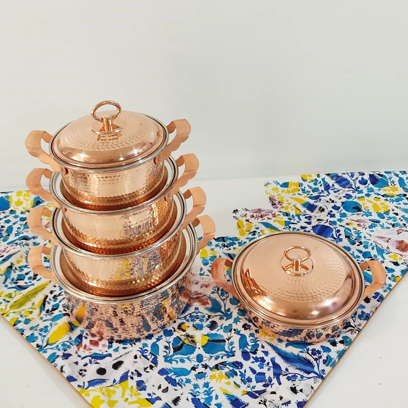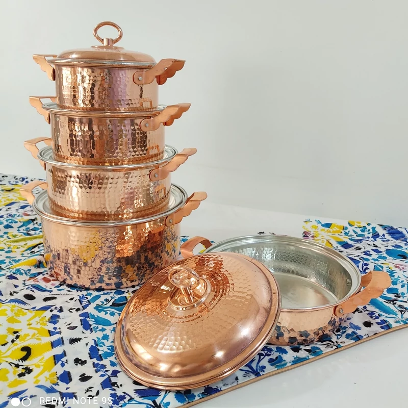 یک سرویس کامل قابلمه در 4 سایز مختلف همراه با یک ماهی تابه در دار قطر 22 دسته دار داخل قابلمه و ماهیتابه قلع کاری شده و همگی چکش کاری شده هستند قابلمه ها رنگ ثابت و نانو شده میباشند ورق بسیار ضخیم و شفاف