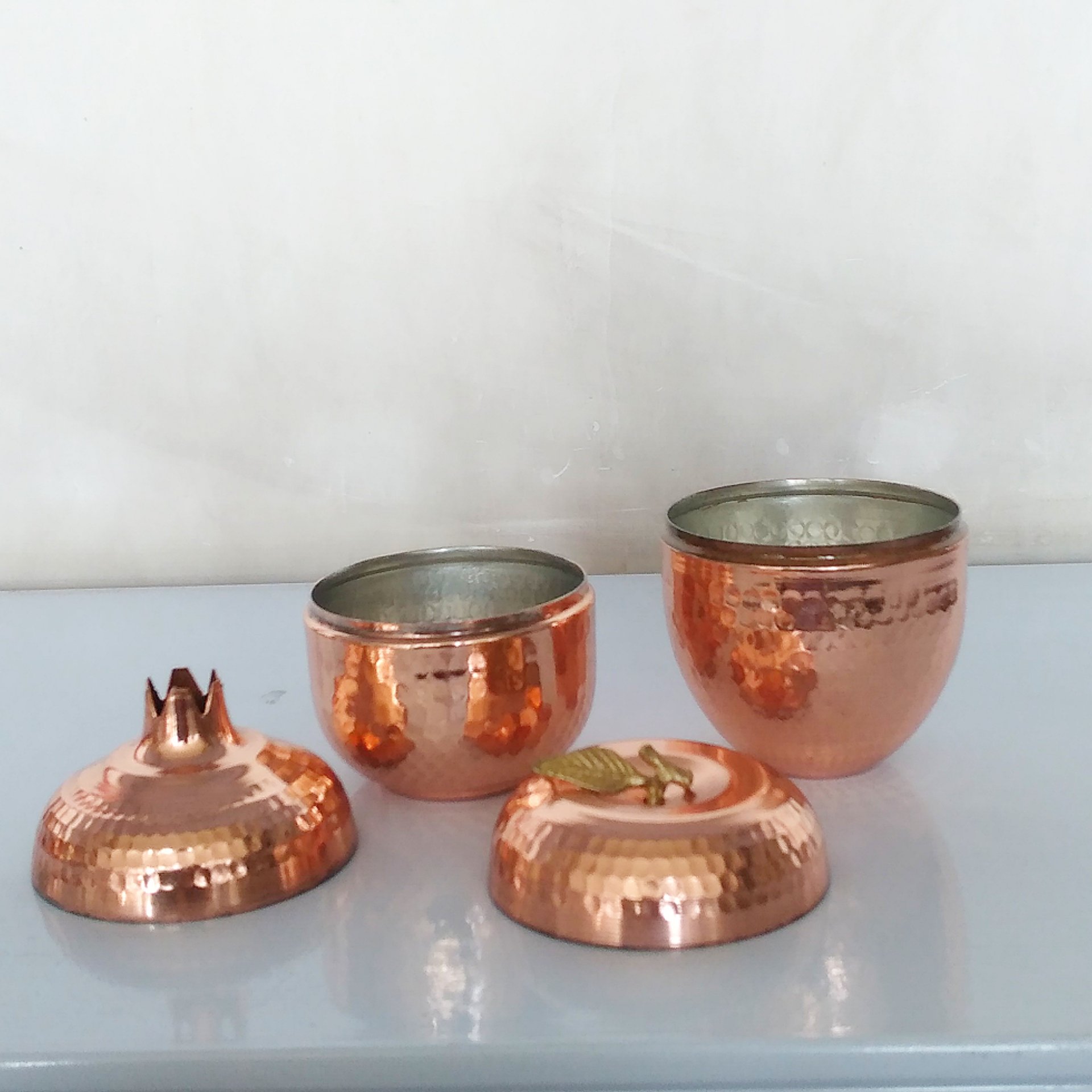 بسته ی دوتایی قندان انار و سیب مسی زنجان اگر تکی خاسید تو غرفه تکیشون رو هم گذاشم (انار تکی یا سیب تکی) هر دو کار داخلشون قلع شده و بیرون کار نانو شده که سیاه و کدر نشن و همیشه شفاف و براق بمونن چکش کاری شدن و از بهترین و اعلاترین ورق مسی ساخته شدن