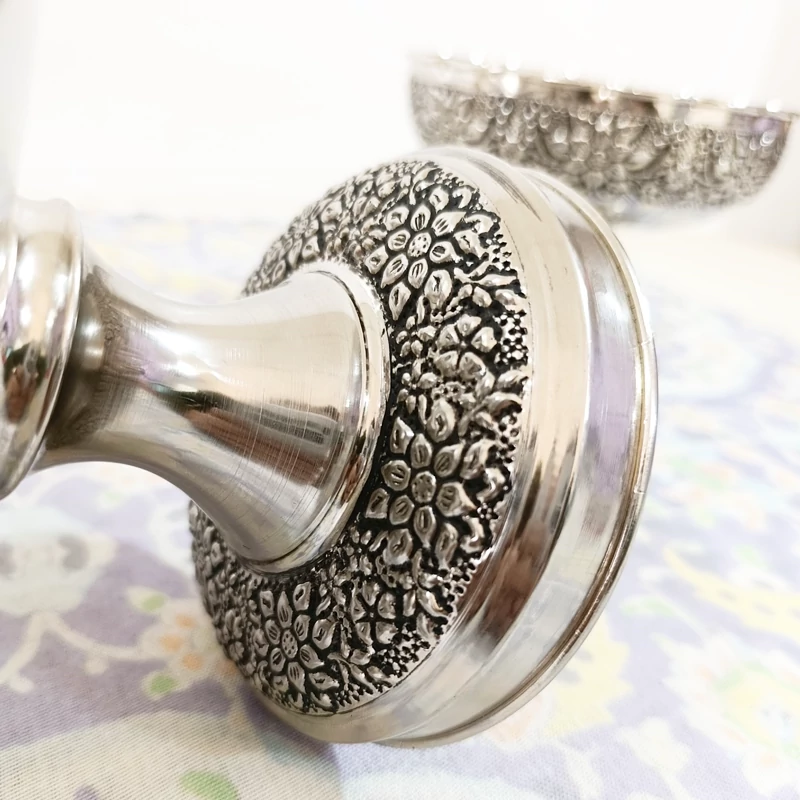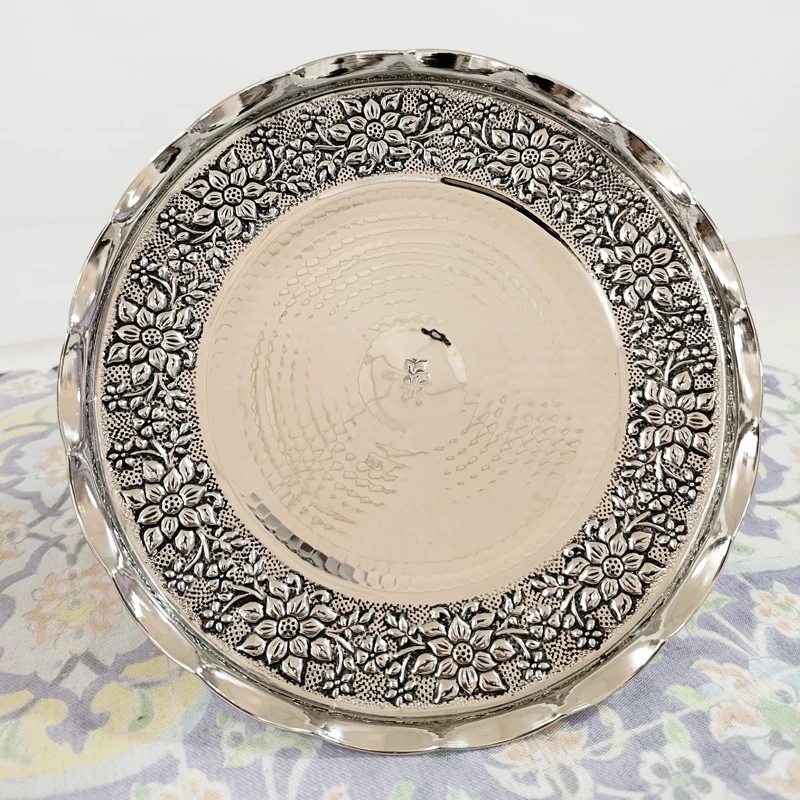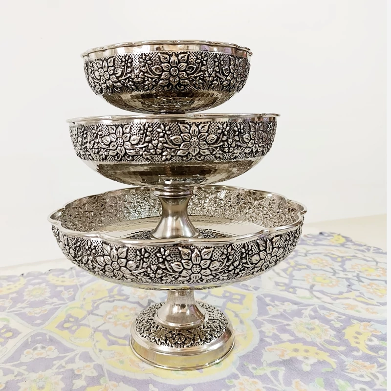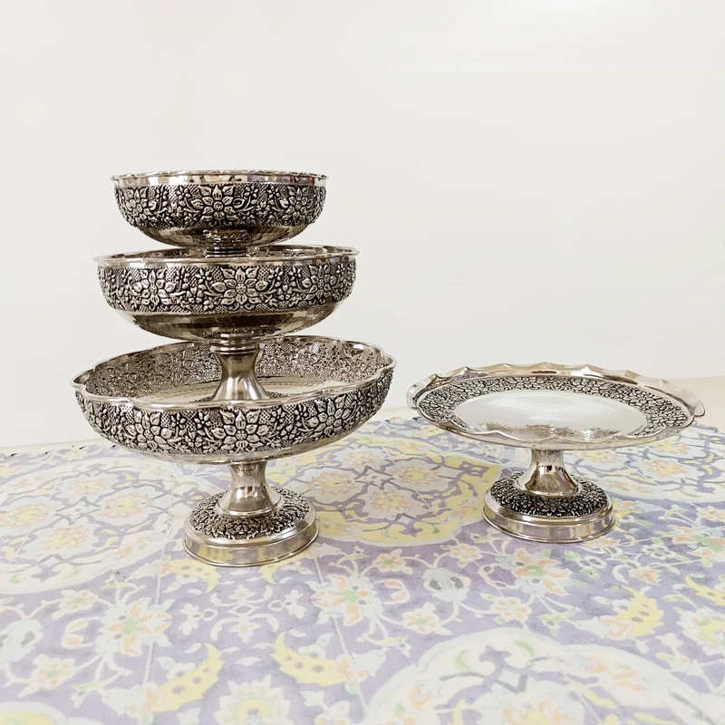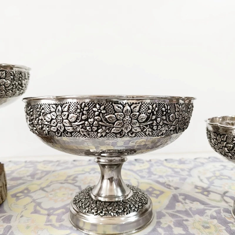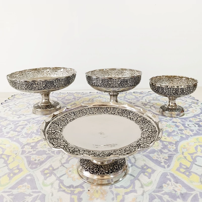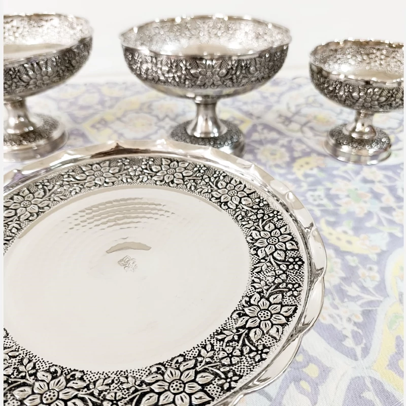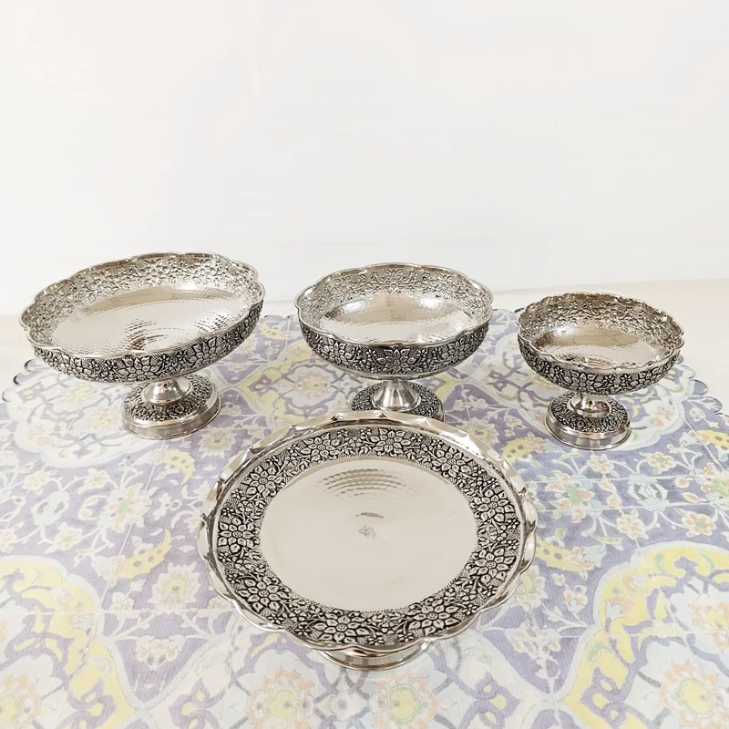 سرویس چهار تیکه زیبای تمام مسی زنجان چکش کاری شده طرح گل برجسته قلم کاری آبکاری کروم بسیار ضخیم شفاف و براق شیرینی خوری آجیل خوری شکلات خوری میوه خوری