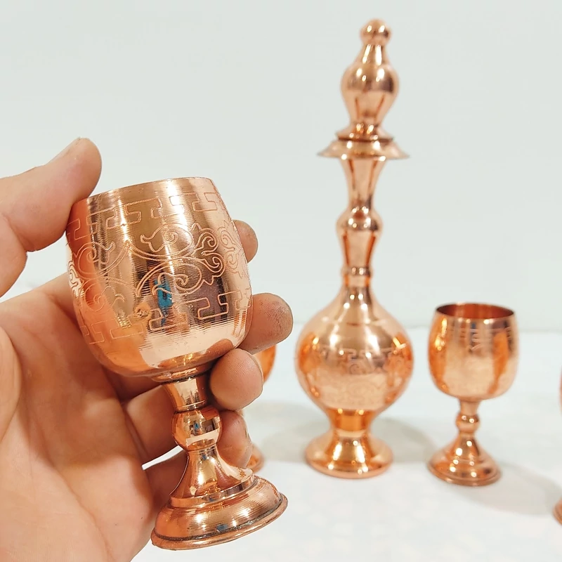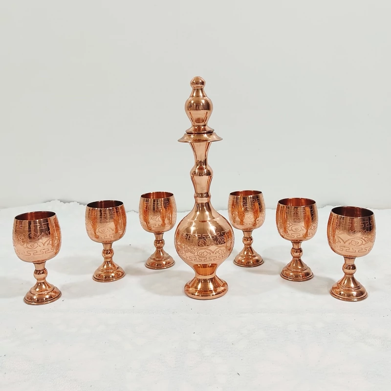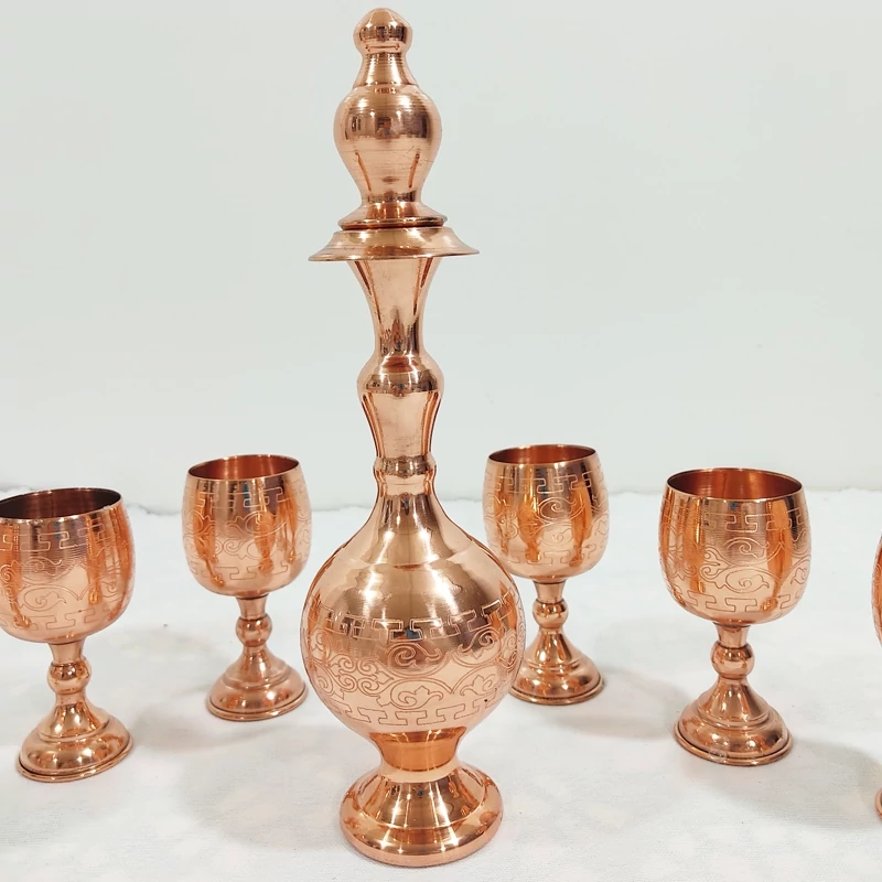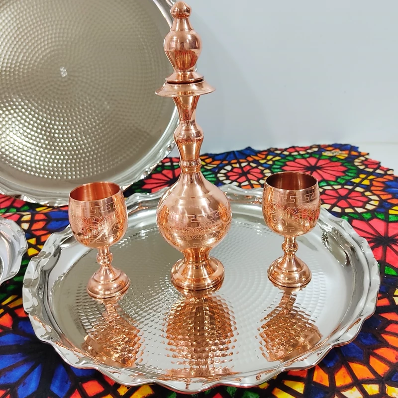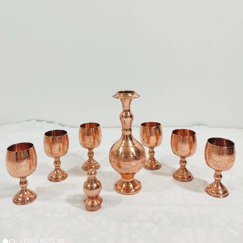 یک عدد تنگ تمام مسی دار دار طرح دار همراه شش عدد جام مسی طرح دار همگی ساخته شده با خالص ترین ورق مسی رنجان رنگ ثابت نانو شده اگر سینی هم خاستید در گفتگو پیام بدین