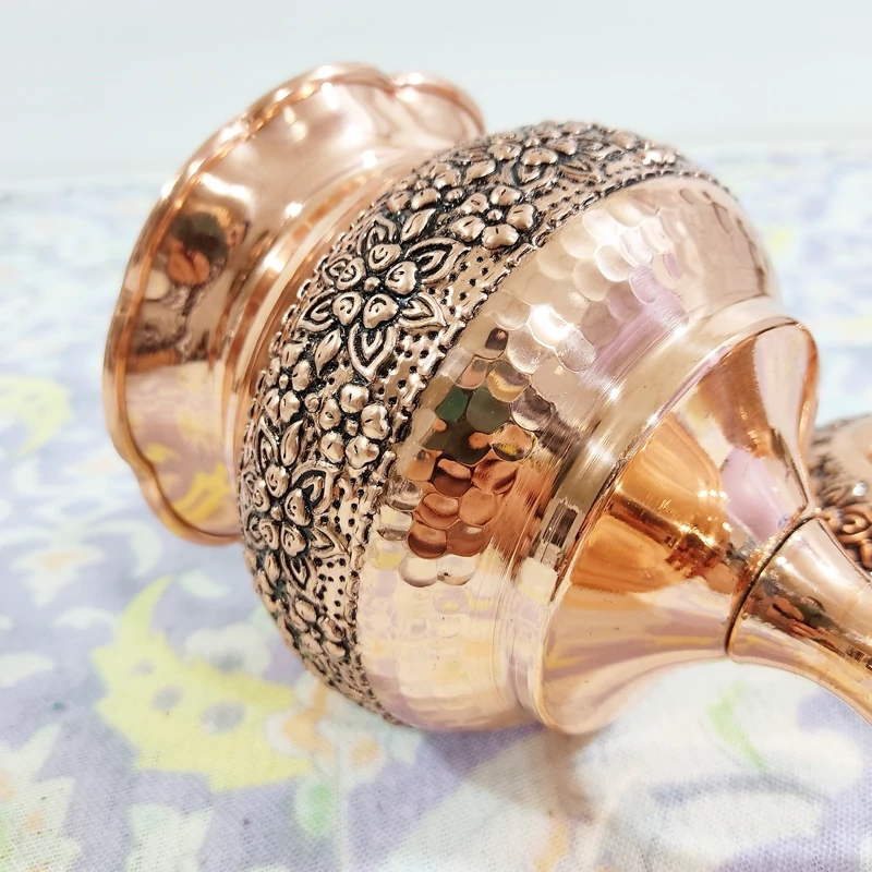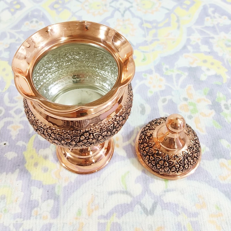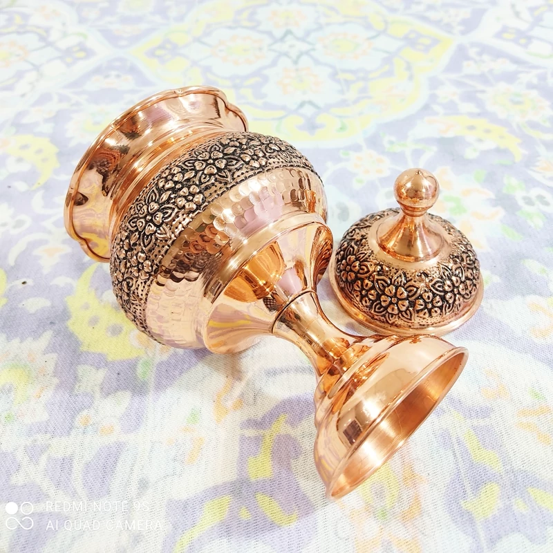 قندان لب چین پایه دار تمام مسی زنجان رنگ ثابت با ضمانت با گل های بسیار زیبای برجسته سیاه قلم روی بدنه و درب محصول داخل قلع کاری شده محصول بسیار زیبا با خالص ترین ورق مسی