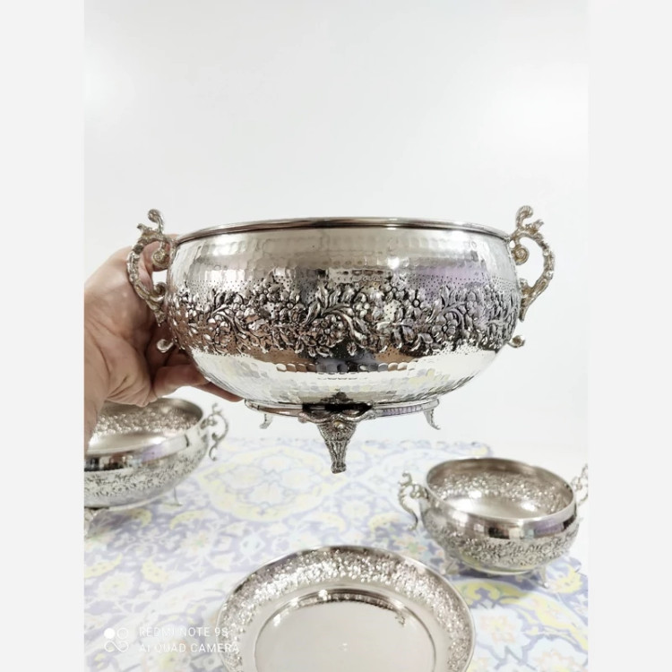 این سرویس پذیرایی خاص، با طراحی گلکاری شده و چکشکاری ظریف، جلوهای شیک و مجلل به میز پذیرایی شما میبخشد. ساختهشده از مس ناب زنجان، با آبکاری کروم براق و پوشش نانو هم انجام میشه مقاومت بالایی در برابر تغییر رنگ، خط و خش و اکسید شدن دارد.