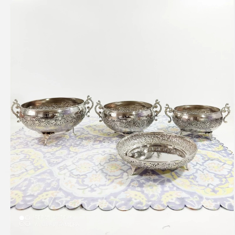 سرویس پذیرایی مسی کروم شده و نانو شده مدل اطلس گل کاری شده 4 تیکه چکش کاری شده