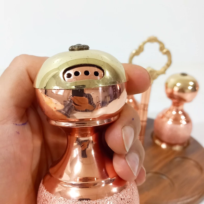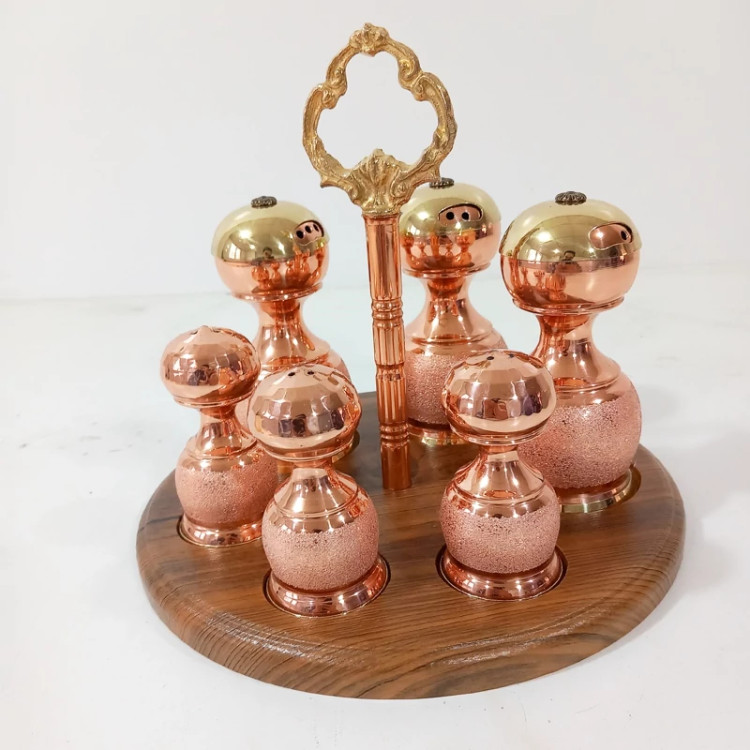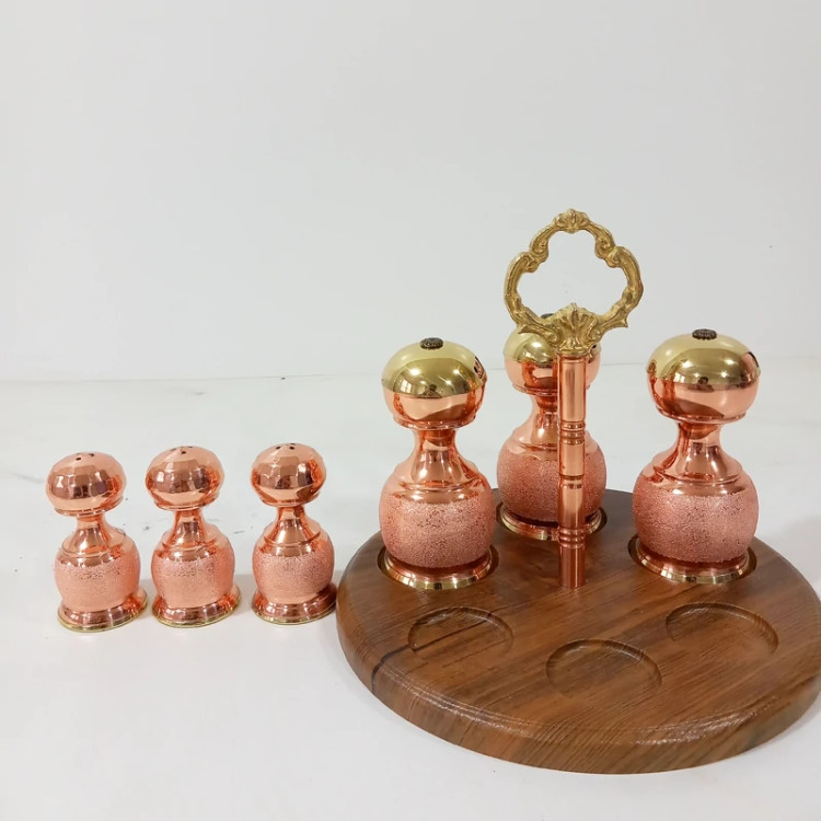 سرویس پاسماوری جا ادویه و نمکدان مسی با استند چوبی