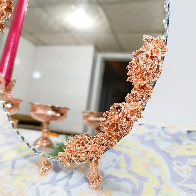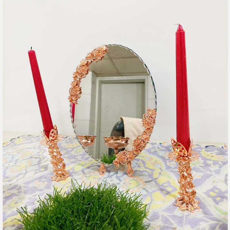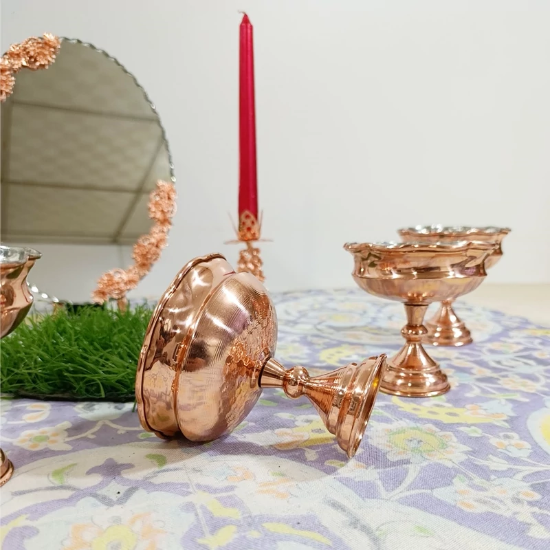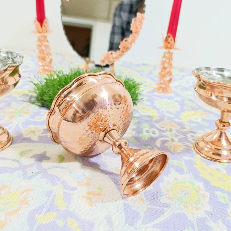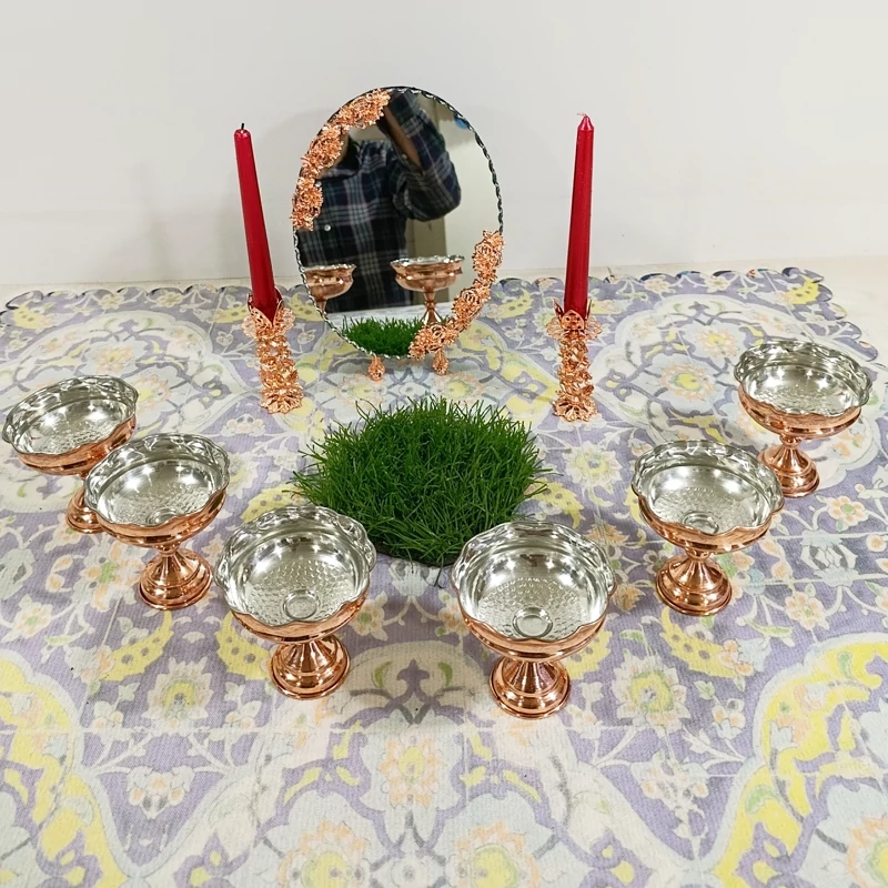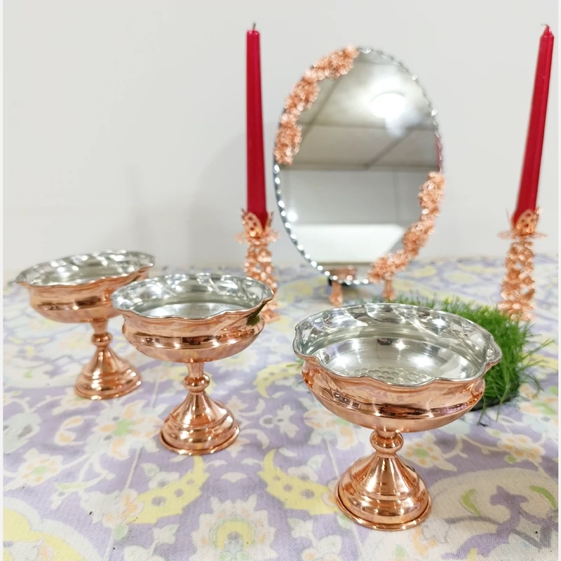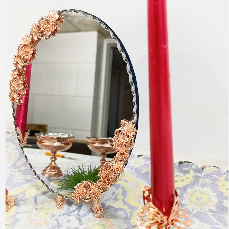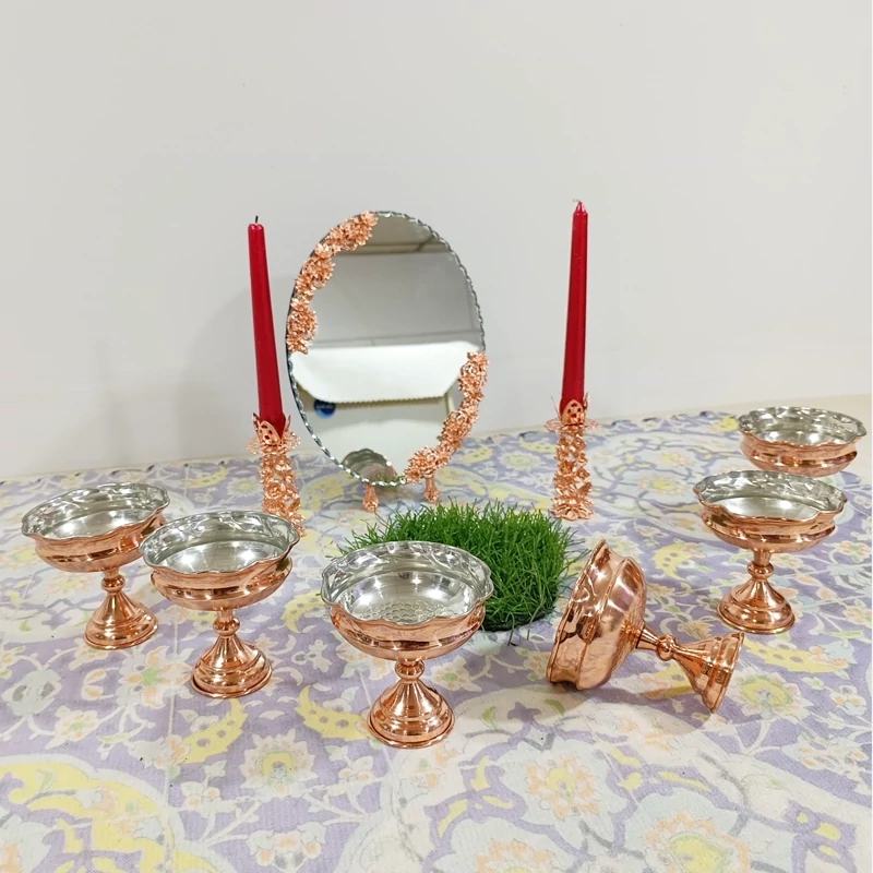 آینه گل کاری شده با آبکاری مسی کار شیک و زیبا برای سفره های هفت سینتون دارای پایه و پایه نگه دارنده کار با کیفیت با آینه با کیفیت ارسال رایگان و شش عدد هفت سین یا تنقلات خوری تمام مسی چکش کاری شده دست ساز نانو شده با قطر 10 سانتیمتر