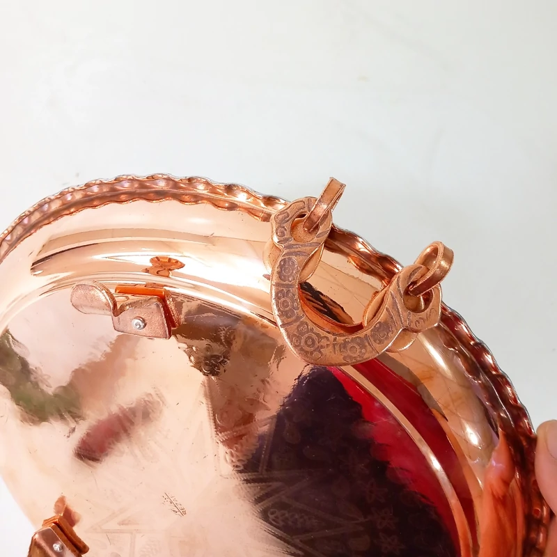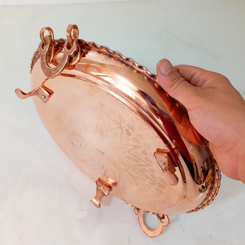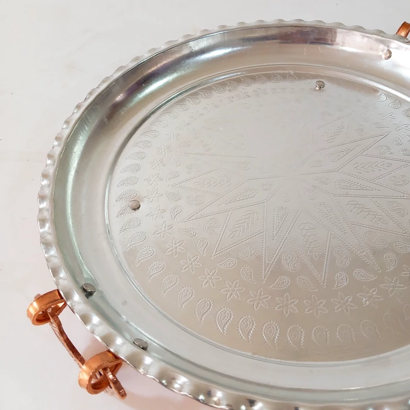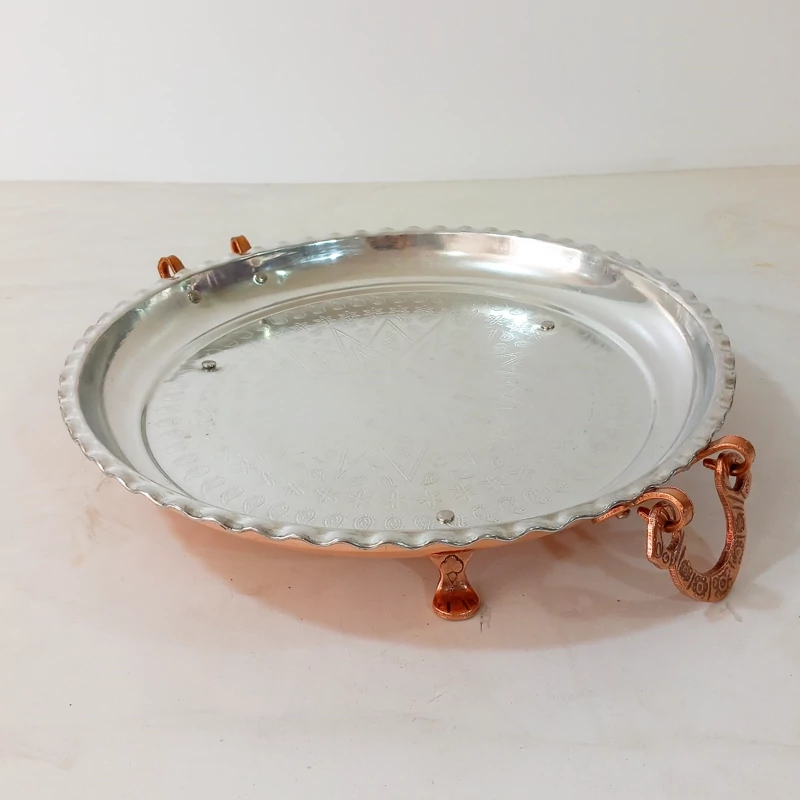 مجمع طرح دار مسی زنجان دسته دار و پایه دار که جنس دسته و پایه مس میباشد داخل ظرف قلع کاری شده و بیرون مسی است بیرون سینی نانو شده که همیشه شفاف و براق بماند این سینی مسی زنجان در ۵ سایز مختلف موجود است