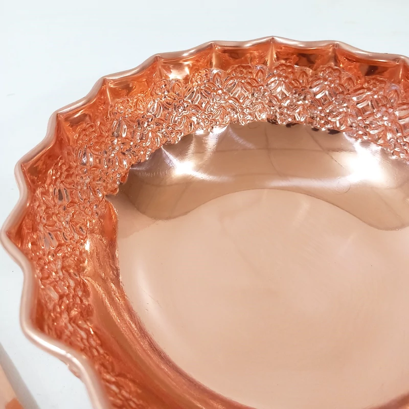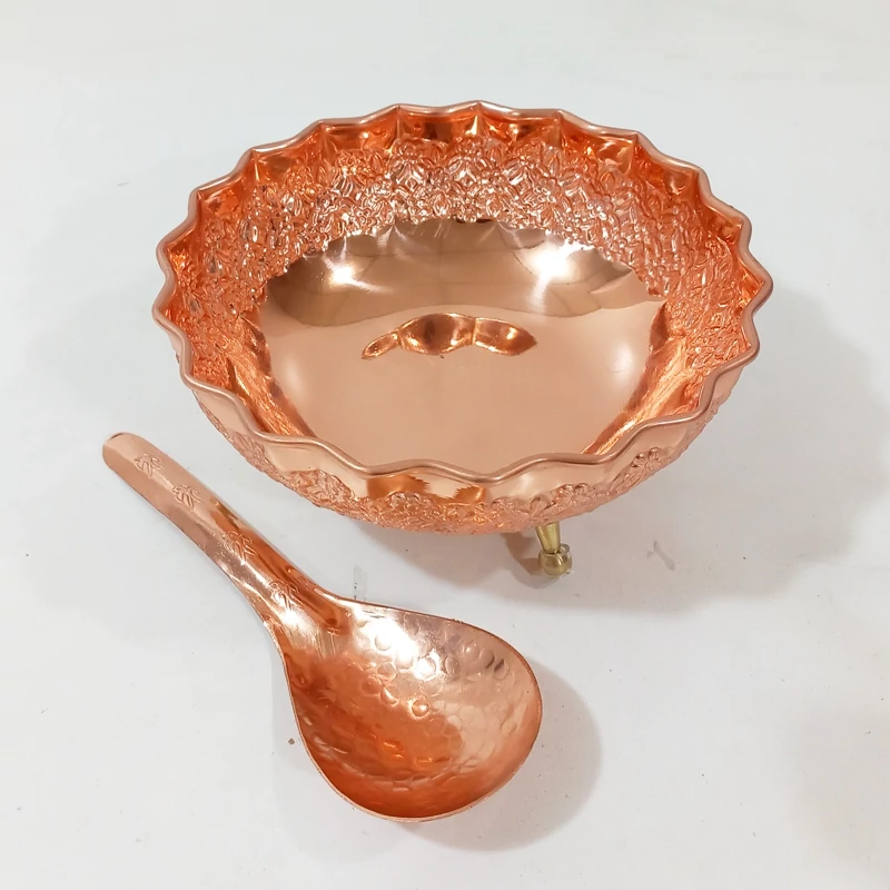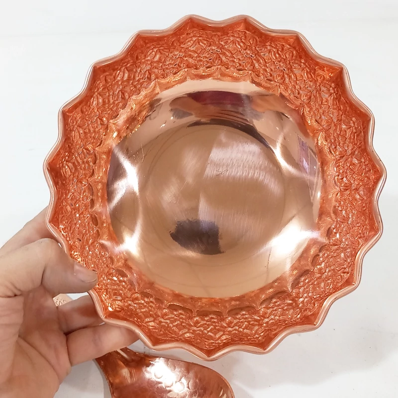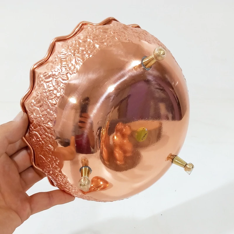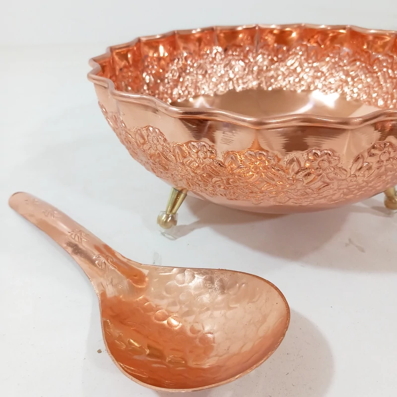 آجیل خوری تمام مسی طرح ریز گل برجسته شفاف و براق سه پایه برنجی که به بدنه جوش خورده نانو شده و رنگ ثابت با ضمانت همراه با یک قاشق آجیل دست ساز نانو شده این کاسه آجیل خوری مناسب میوه و شکلات هم میباشد