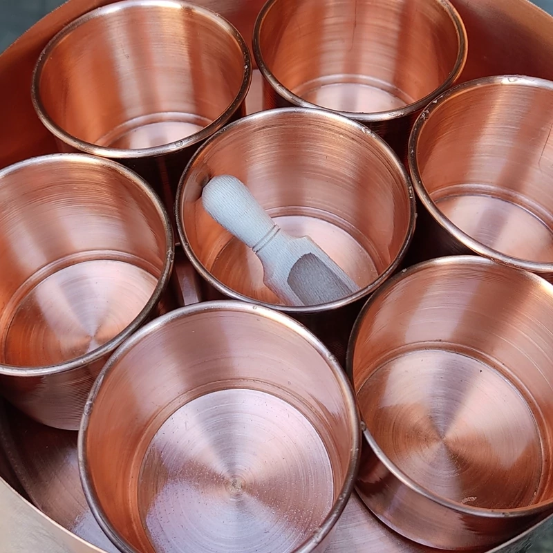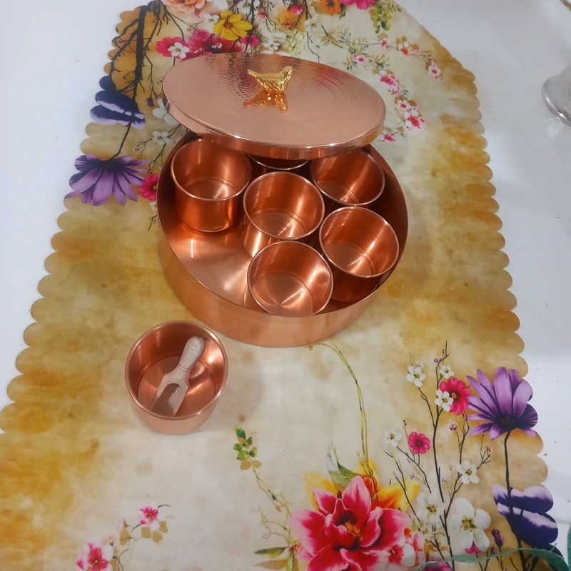 جا ادویه مسی نانو شده ارسال رایگان با ظرف بزرگ داخل 7 تا ظرف با یک قاشق چوبی کار جدید و شیک چکشی مناسب ادویه تنقلات و...