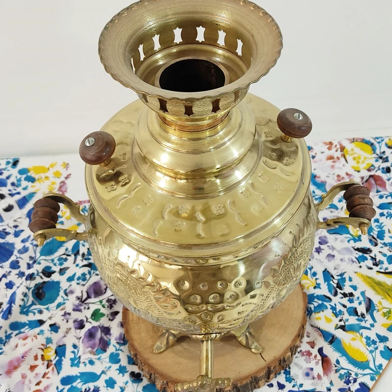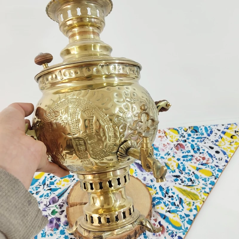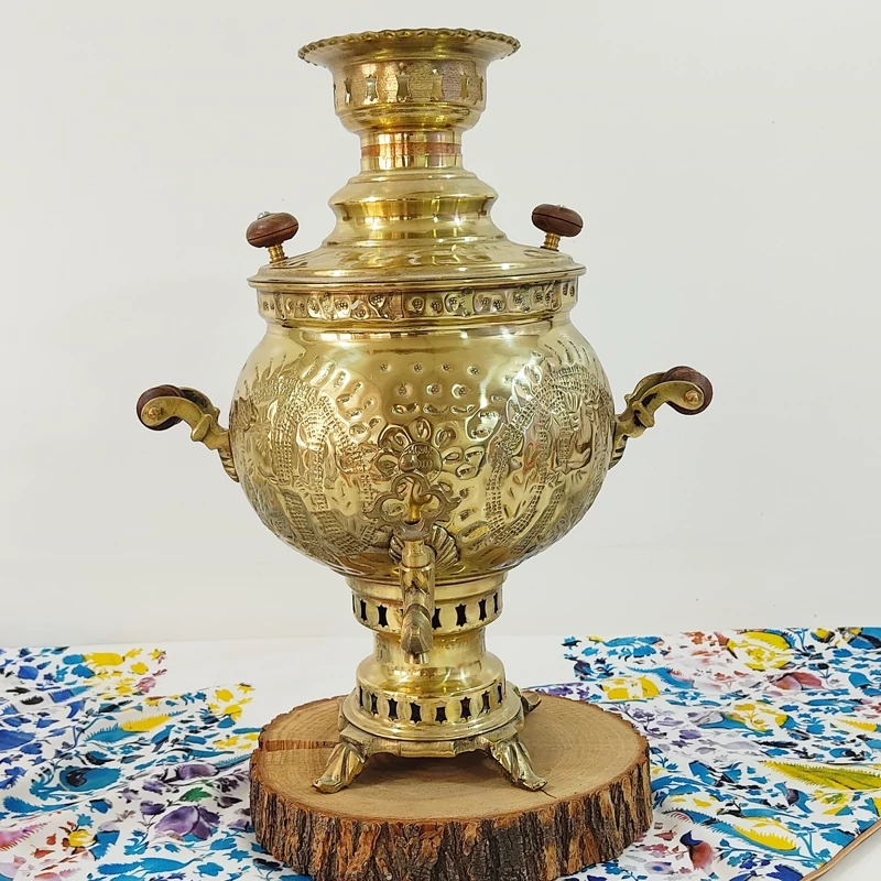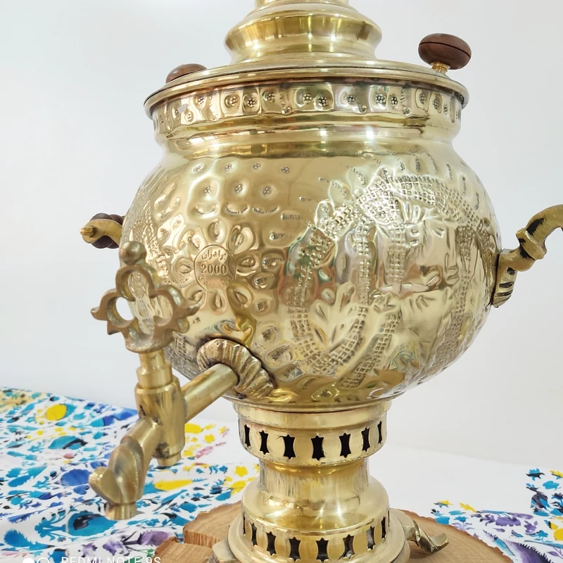 سماور جنس برنجی ضخیم و با کیفیت قلم کاری شده کار اعلا نانو شده مدل ذغالی ظرفیت سماور شش لیتر این سماور سرویس چهار تیکه هم دارد شامل پارچ و قوری و سینی و کاسه درصورت لزوم میتوانید ان راهم سفارش دهید