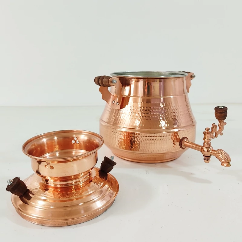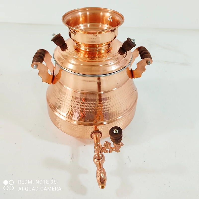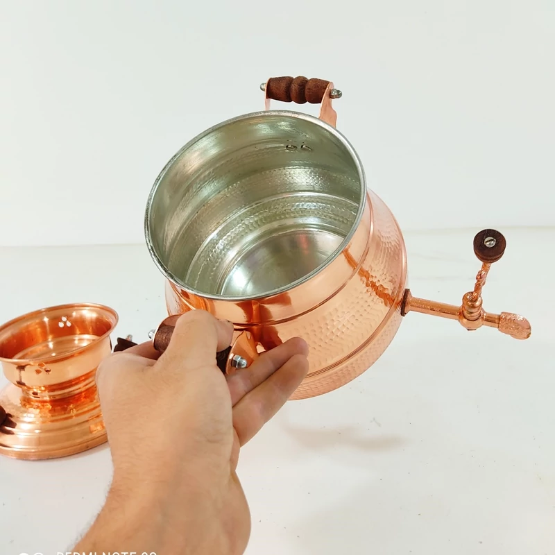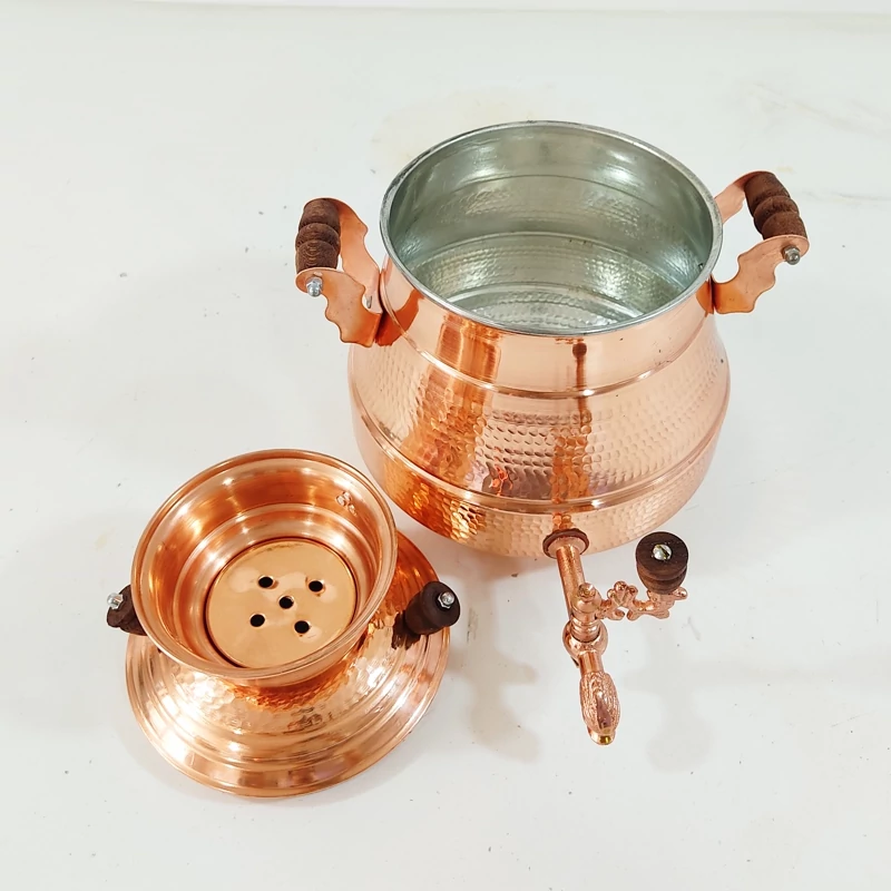 کتری یا سماور روگازی شیر دار مسی زنجان کاملا دست ساز چکش کاری شده و داخل قلع کاری شده رنگ ثابت نانو شده حجم 3لیتری ارتفاع 25 سانتیمتر قطر دهانه 15 سانتی متر ارسال رایگان دستگیره ها برای راحتی و عدم انتقال حرارت از چوب
