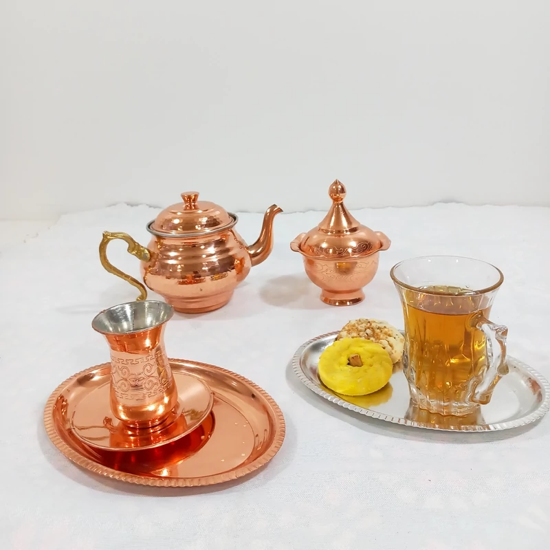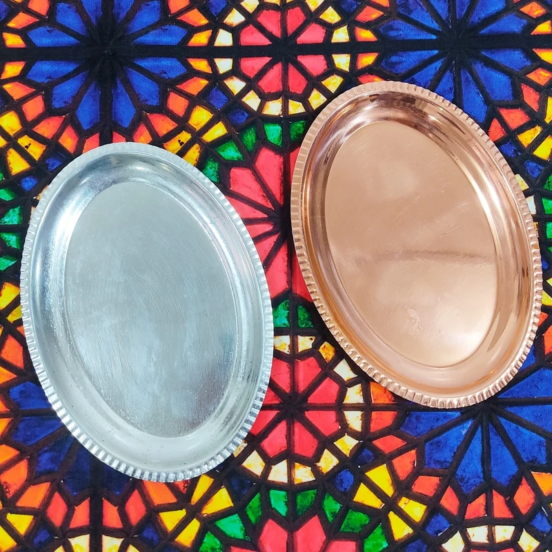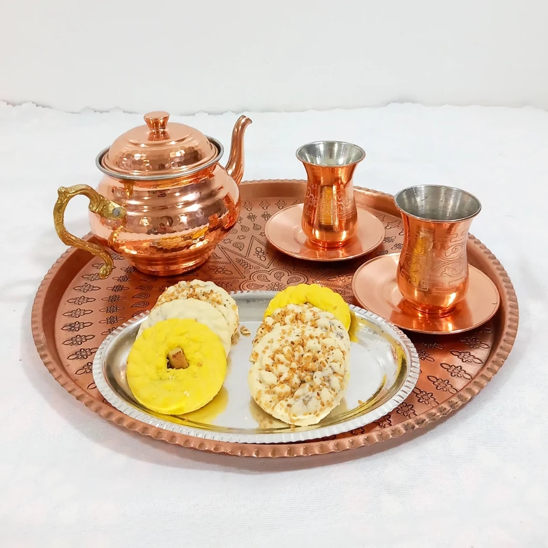 سینی زیر استکانی بسیار کاربردی مناسب چای و شیرنی رنگ ثابت دور چین دار طول 20 عرض 14 نانو شده ساخته شده با خالص ترین ورق مسی در دو رنگ مسی و قلع شده در صورت خرید اطلاع بدید که کدوم رنگو میخواید در صورت اطلاع ندادن رنگ موجود رو میفرستیم.