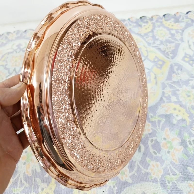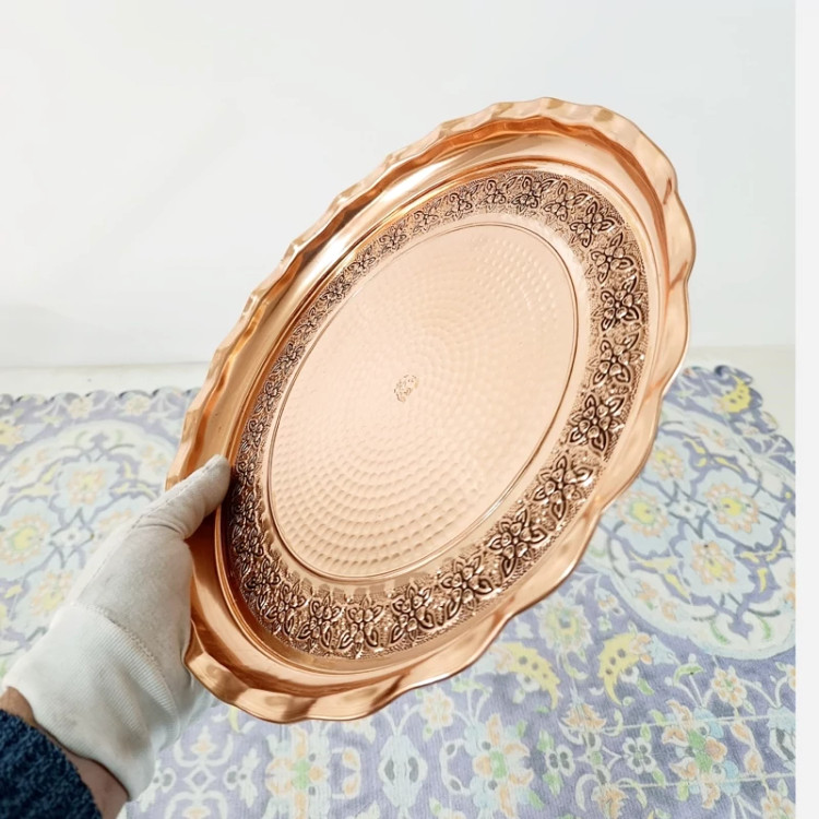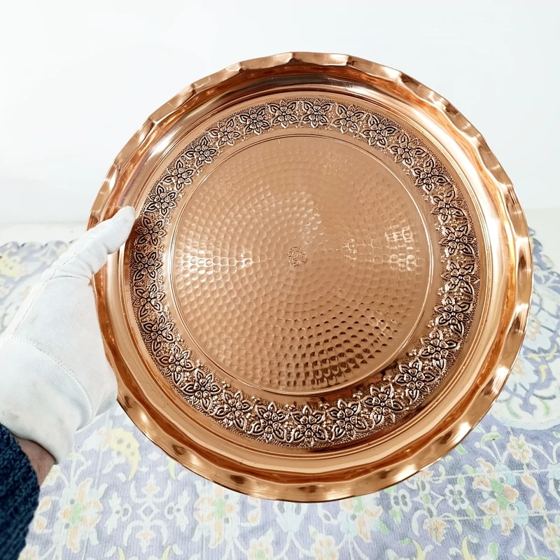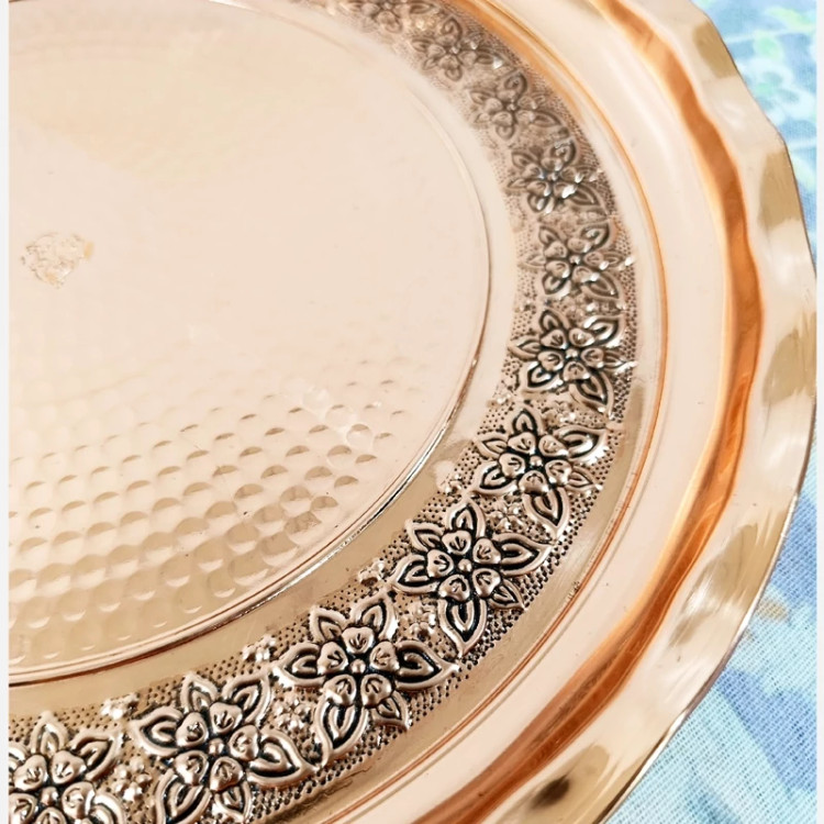 سینی پذیرایی تمام مسی زنجان طرح برجسته کاری گل و برگ سیاه قلم