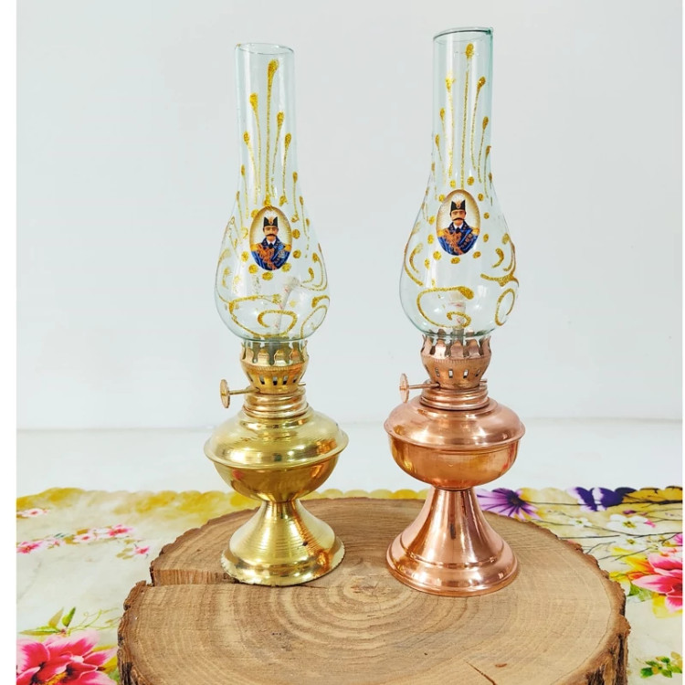 چراغ گردسوز دو عددی طرح شاه عباسی موجود در دورنگ مسی و طلایی
