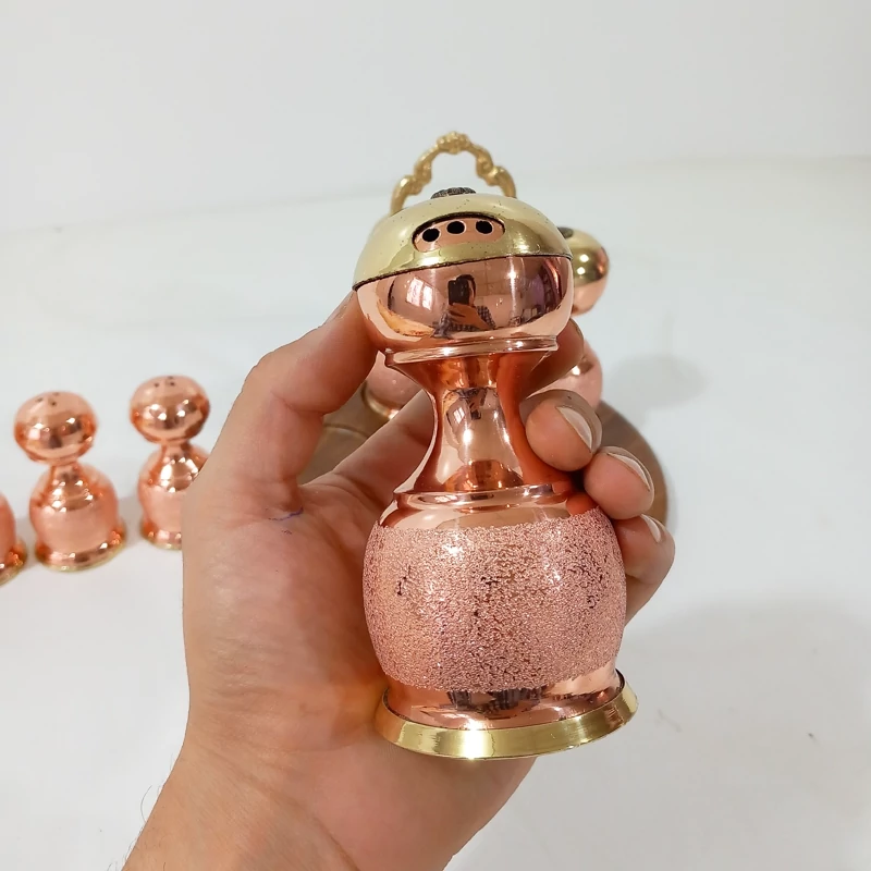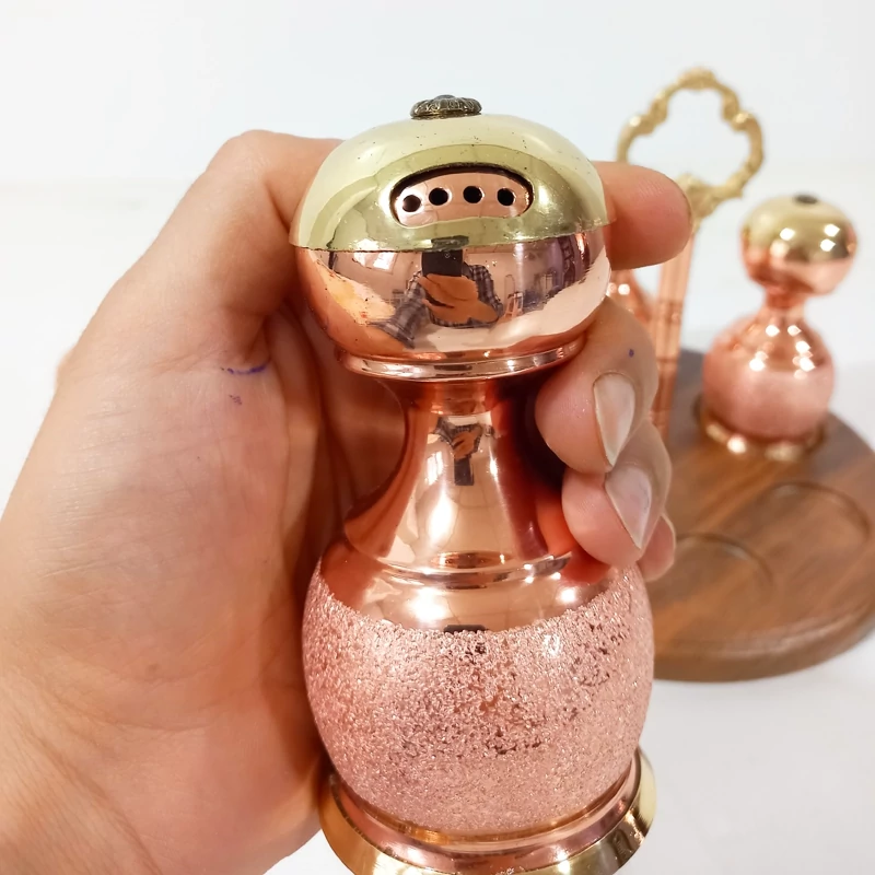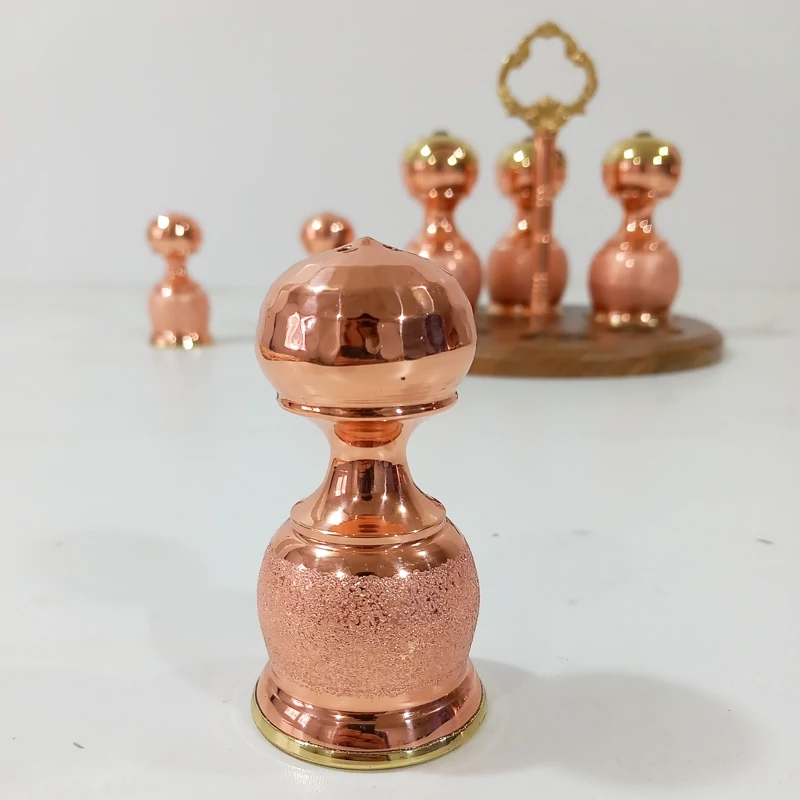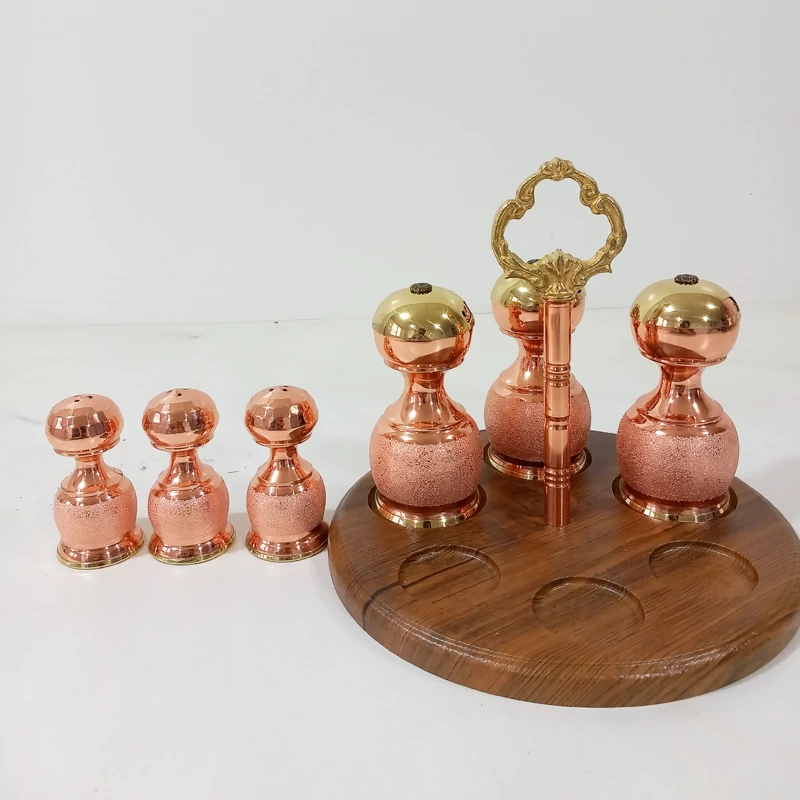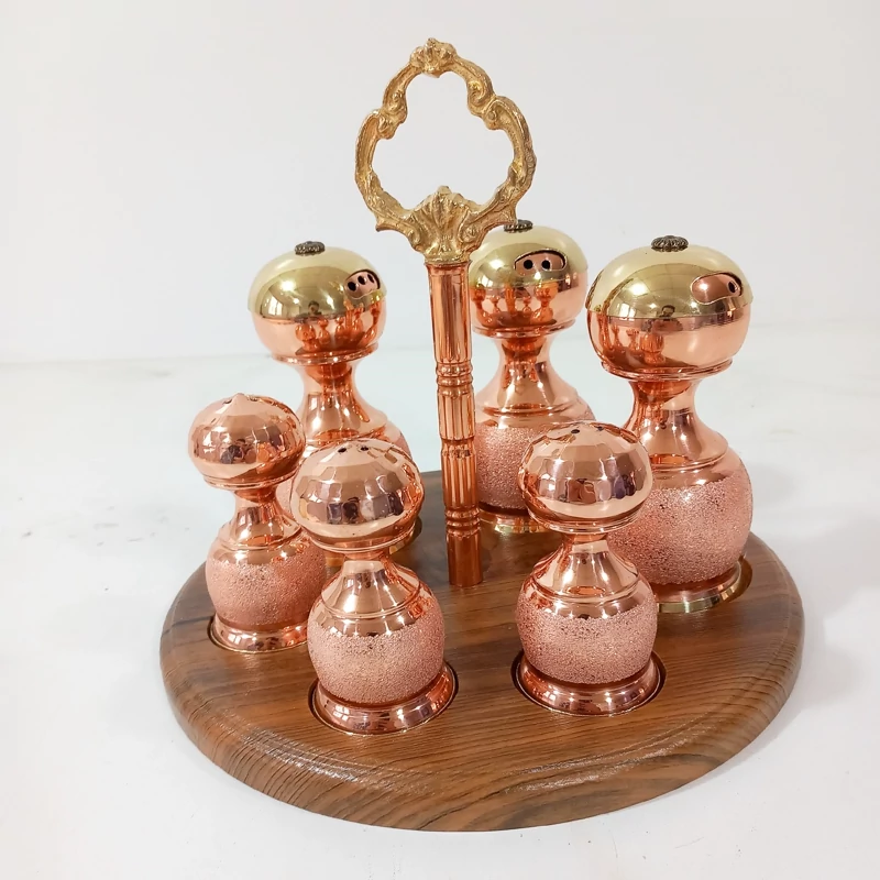 ست نمکدان و جا ادویه شش تایی سه عدد نمکدان و سه عدد جا ادویه بزرگ کف همگی طلایی از جنس برنج که تلفیق بسیار زیبایی دارد استند چوبی با میله وسط مسی و دسته دار این کار طرح شنی است که مدل کروم و طرح الماس تراش آن نیز موجود است این کار نانو شده است